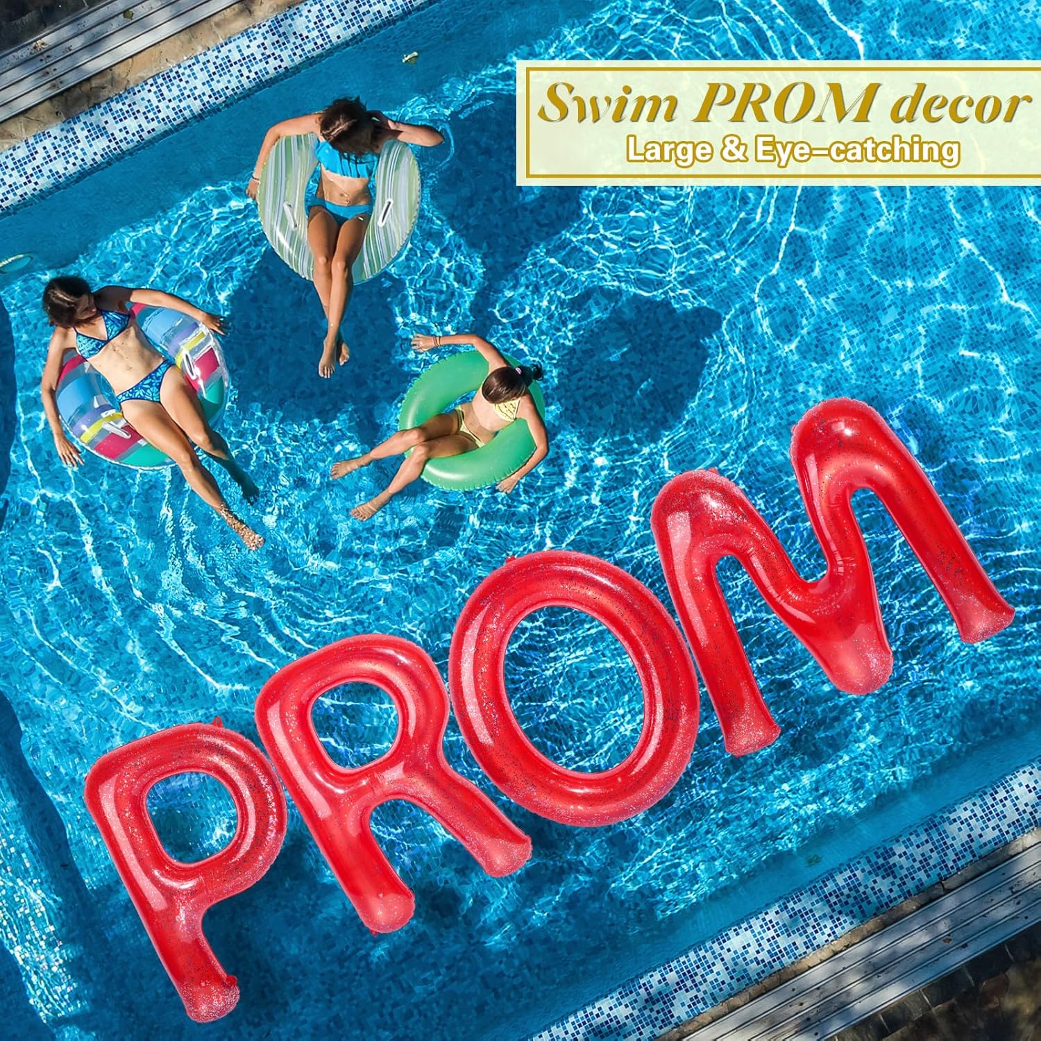 Celebrate Your Milestones in Style: the style of these 48" large pool decorations are crafted for the upcoming 2025 graduation theme, kick off the graduation season with an unforgettable pool party featuring the eye catching letters [PROM], celebrate your achievements and create lasting memories with this eye catching decor