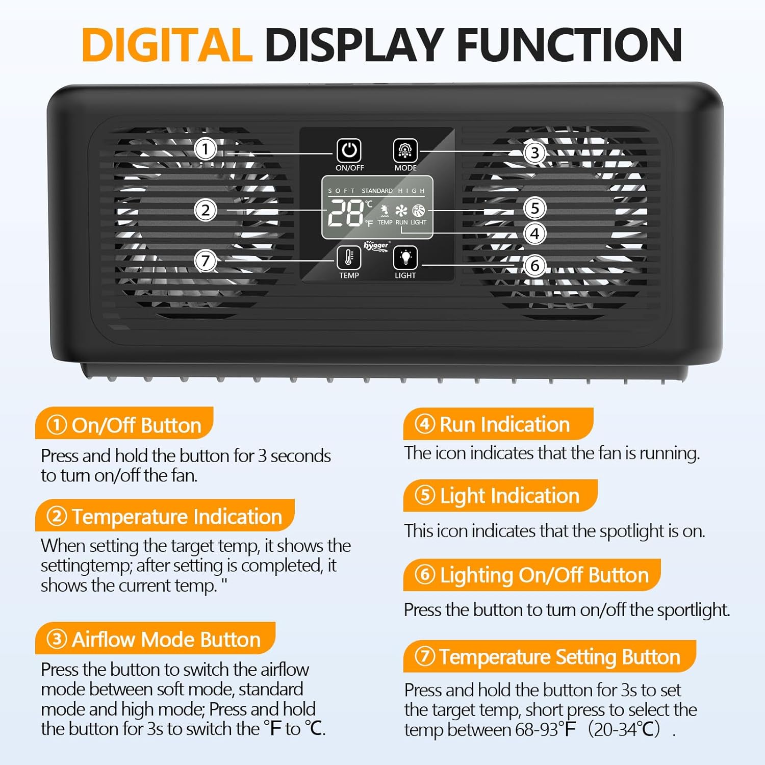 【Intelligent automatic start and stop】3-level wind speed adjustment, 68-93℉ adjustable temperature range, you can choose the appropriate wind speed and target temperature according to your needs, very convenient! The temperature probe continuously monitors the aquarium temperature and automatically starts and stops to maintain the target temperature. The digital display shows the water temperature, fan speed level and operating mode in real time. Whether it is day or night, just set it and leave it, the aquarium fan will ensure precise control and provide the right water temperature for your beloved fish