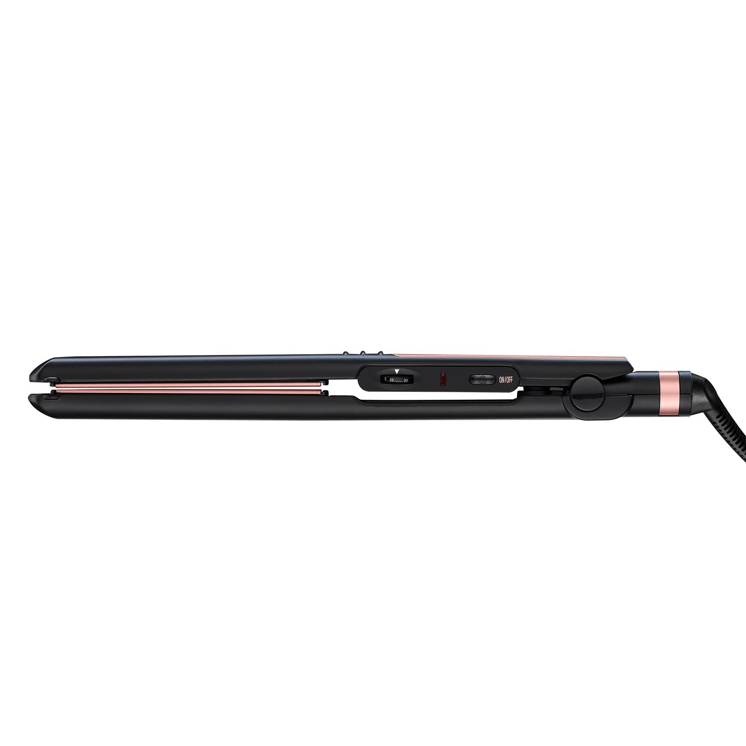 - Extra-long, rose gold ceramic floating plates offer fast styling and better contact with hair.