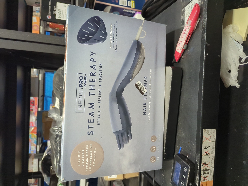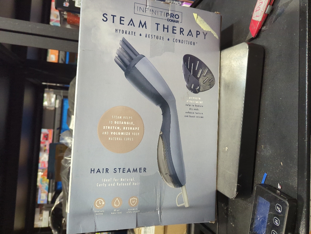 Bring your curls back to life with the InfinitiPRO by Conair® Steam Therapy Hair Steamer. This powerful tool uses the power of steam to hydrate, restore, and condition (when used with hair conditioners/masks) your hair. By opening the cuticles, it allows deep absorption of hair conditioners and masks, ensuring your strands are fully nourished. The unique prongs help to penetrate curls, lifting and separating your hair to reactivate your curl pattern and promote a more defined, bouncy curl. Whether your hair is natural, curly, or relaxed, this device is tailored to enhance texture, increase volume, and provide hydration to dry ends. With a 10-minute runtime and a 30-second heat-up time, you’ll quickly see and feel the results. The 80 mL water tank provides continuous steam, while the 7" diffuser attachment targets dry ends and adds volume. Plus, its automatic safety shutoff ensures peace of mind while in use. Ideal for anyone looking to give their curls a fresh, rejuvenated look, the InfinitiPRO by Conair® Steam Therapy Hair Steamer is your go-to for healthy-looking, more vibrant hair. Say goodbye to frizz, tangles, and lackluster curls—this steam therapy tool is here to revitalize your natural beauty!