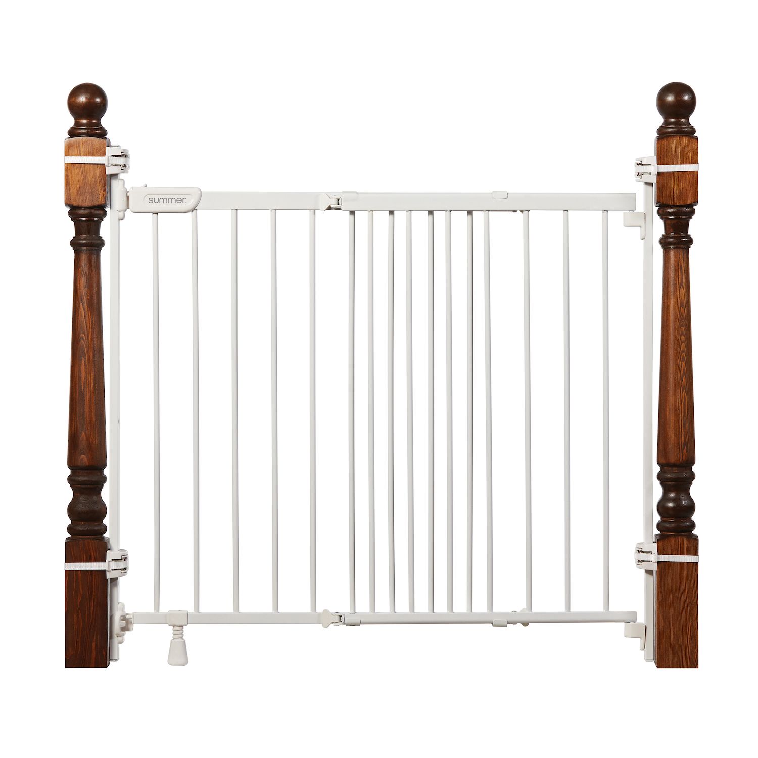 - With the dual installation kit, the white metal gate can be attached to a wall or to most single and double square and round banisters no drilling required on square banisters