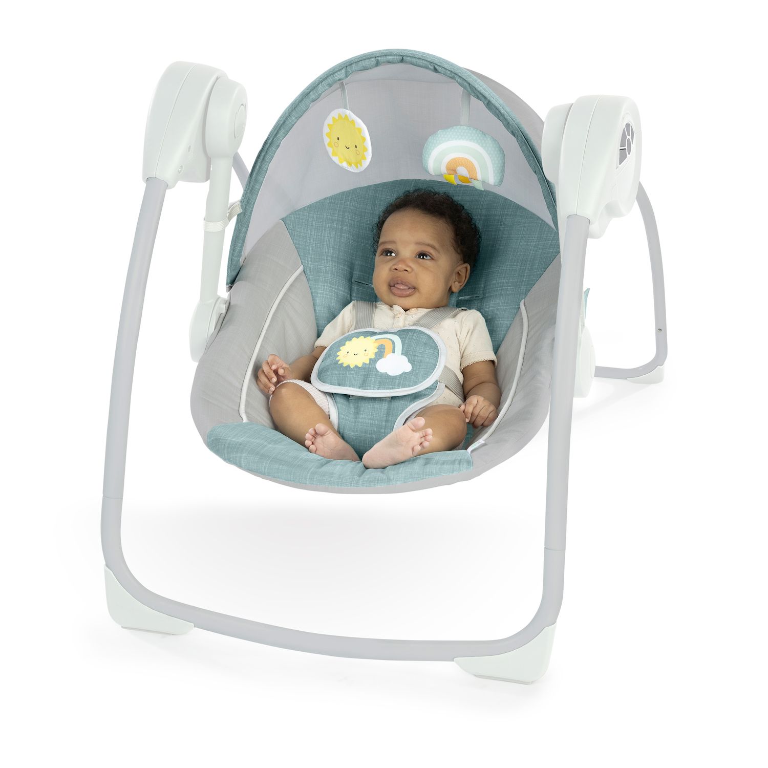 This compact swing is ready to come along for the journey and entertain on the go with 2 toys (1 crinkle sun and 1 plush rainbow). This baby swing is equipped with a large, full canopy to provide your little one with comfort.