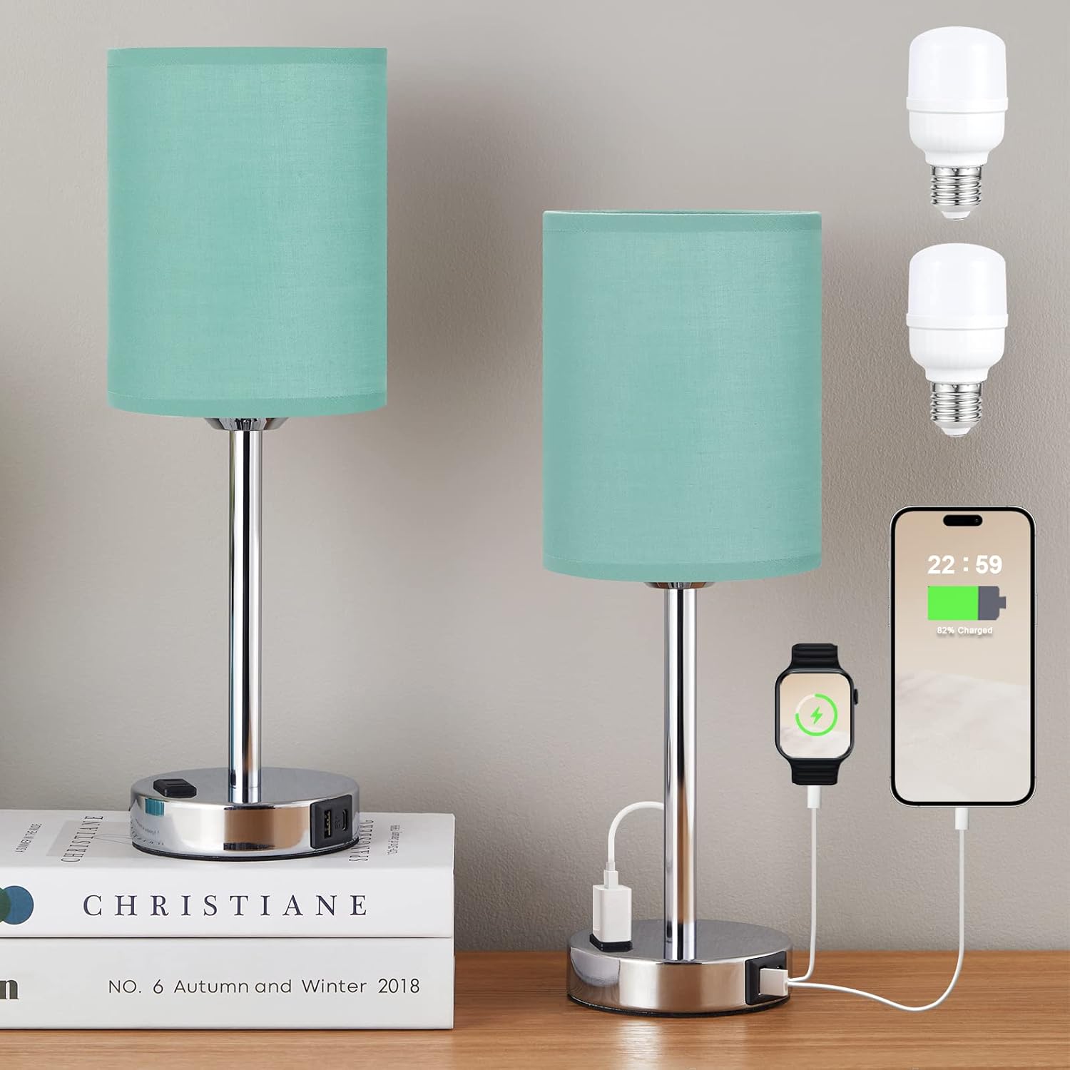 Innqoo Teal Touch Table Lamps Set of 2-3 Way Dimmable Bedside Lamp with USB C and A Ports and Outlets, Modern Nightstand Lamp with Silver Base, Small Bedroom Lamps for Kids Nursery