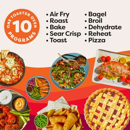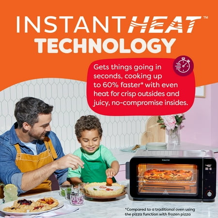 10 Cooking Functions: Air fry, roast, quick bake, sear crisp, toast, bagel, broil, dehydrate, warm, and make pizza—all in one powerhouse appliance with little to no preheat time. Glow and Behold: InstantHeat™ Technology kicks things off in seconds with little to no preheat time*, cooking up to 50% faster** while delivering even heat for crispy outsides and irresistibly juicy bites every time. Guiltless Crisp: InstantCrisp™ Technology delivers that deep-fried crunch with a fraction of the oil, keeping every bite crispy on the outside and tender on the inside. Sear, Sizzle, Savor: Sear Crisp Mode locks in flavor and caramelizes like a pro, perfect for juicy meats and golden finishes. Sneak a Peak: A spacious ClearCook window and bright internal light let you track your food’s progress—no need to open the door and lose heat. Purposeful Precision: Reaches up to 500°F for high-heat cooking, while double-pane glass keeps the exterior cool and safe to touch. Sized Just Right: Compact enough for your countertop but big enough to handle an 12" pizza, 6 slices of toast, or a whole 4 pound chicken! Sleek Design: The durable stainless steel design adds a sleek touch to your kitchen and ensures long-lasting performance. Quick Cleanup: No more fighting about who has to do the dishes. The flip-up lower heating element makes clean-up a breeze. *Except Bake & Sear Crisp Functions **Compared to a traditional oven using the Pizza function with frozen pizza.”