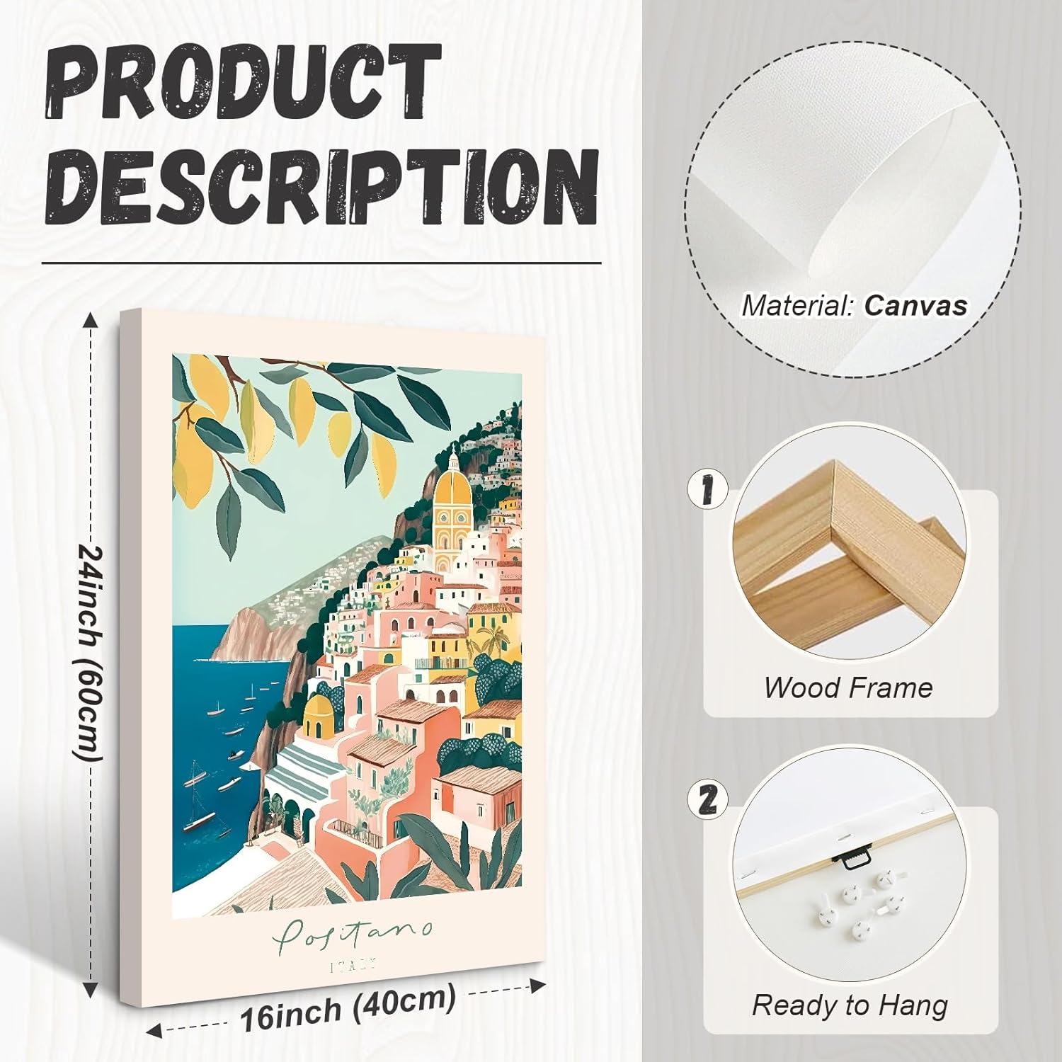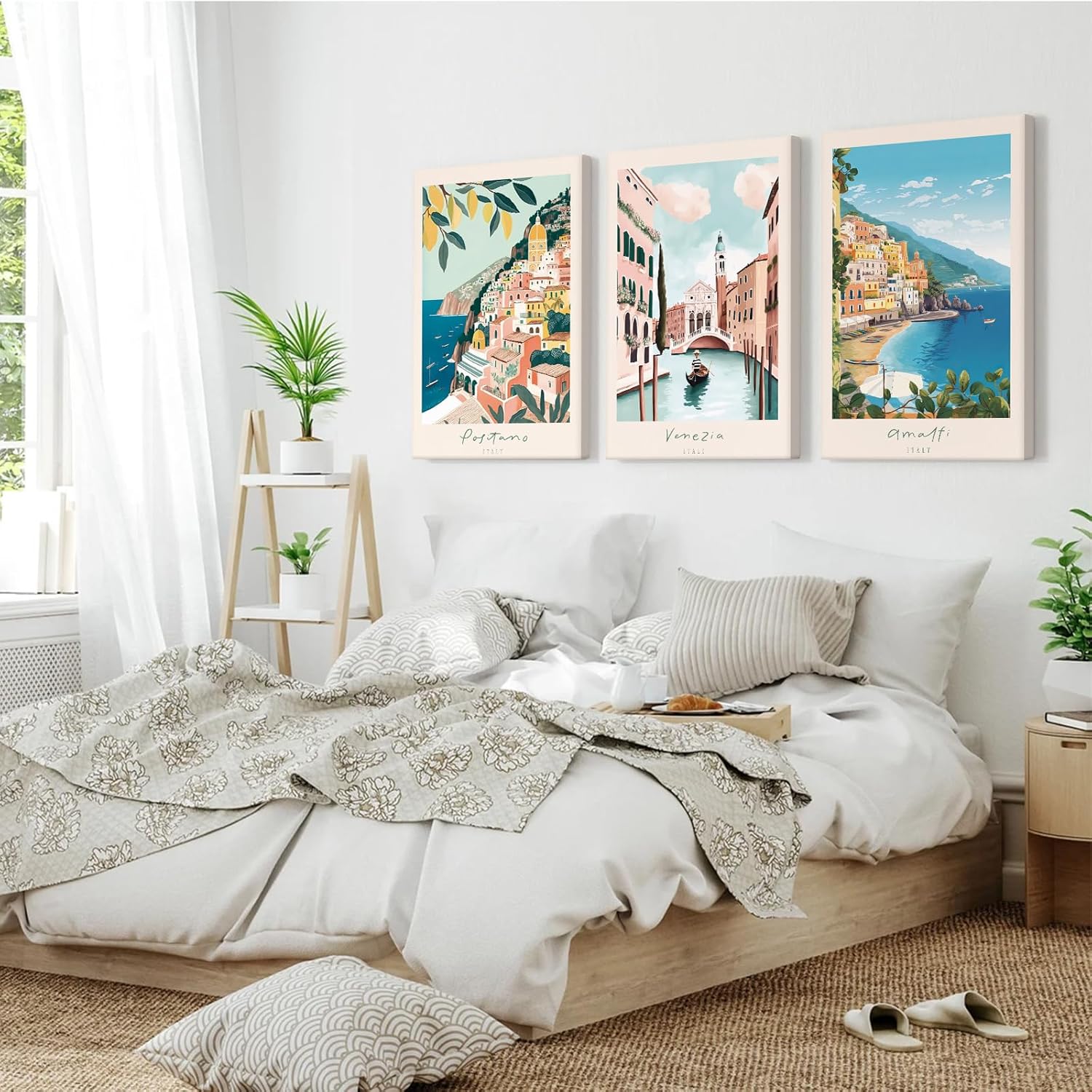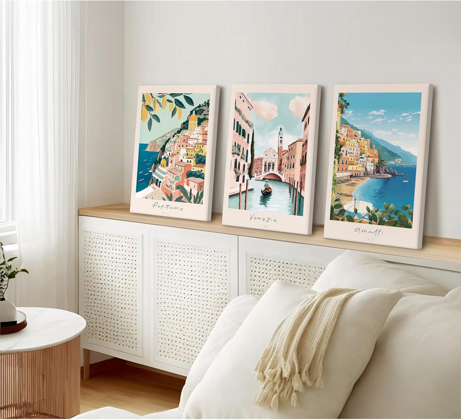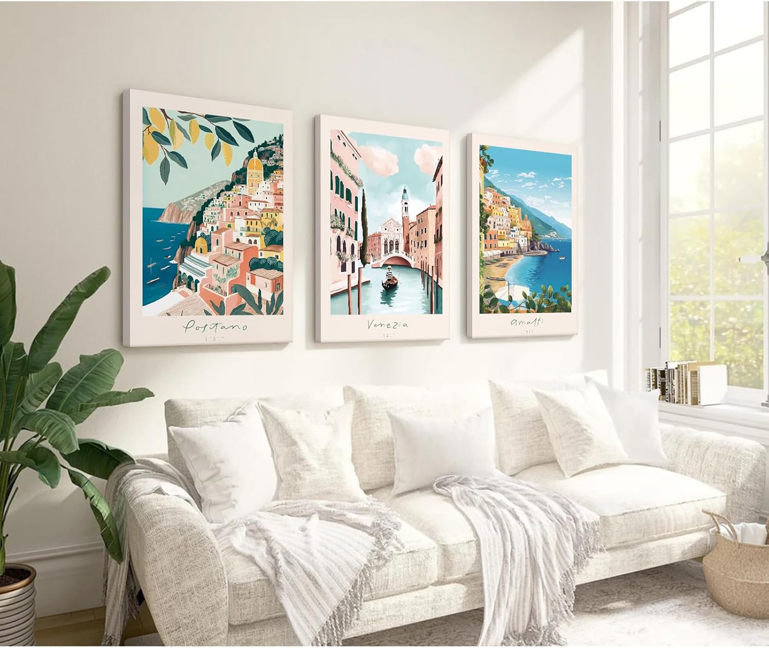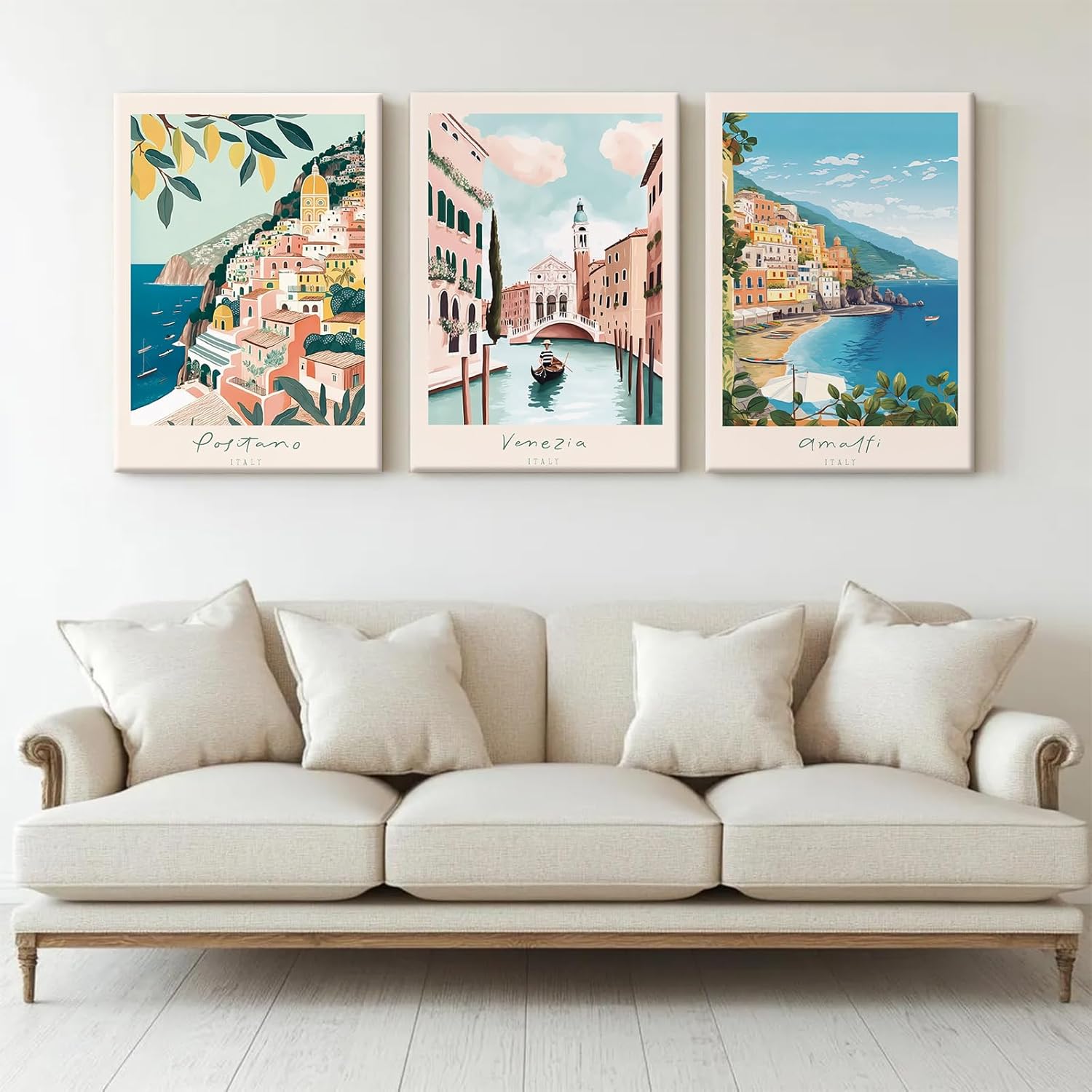 Italy Amalfi Coast Wall Art Italian City Canvas Wall Decor Italy Travel Landscape Wall Art Posters Blue Venice Beach Painting Pictures Italian Modern Artwork for Home 16x24 Inch Framed Set of 3