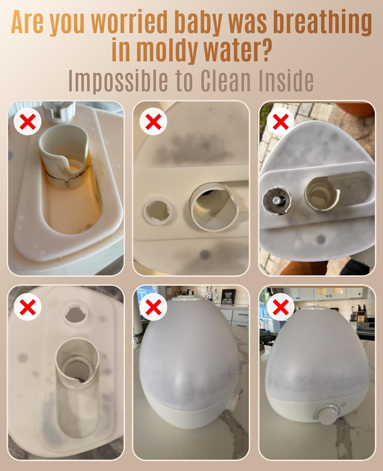 Stainless Steel Humidifier: Are you worried baby was breathing in moldy water? The stainless steel tank can be put into a dishwasher for cleaning, allowing for 100% completely cleaning, thus ensuring a safer and healthier blowing mist.
