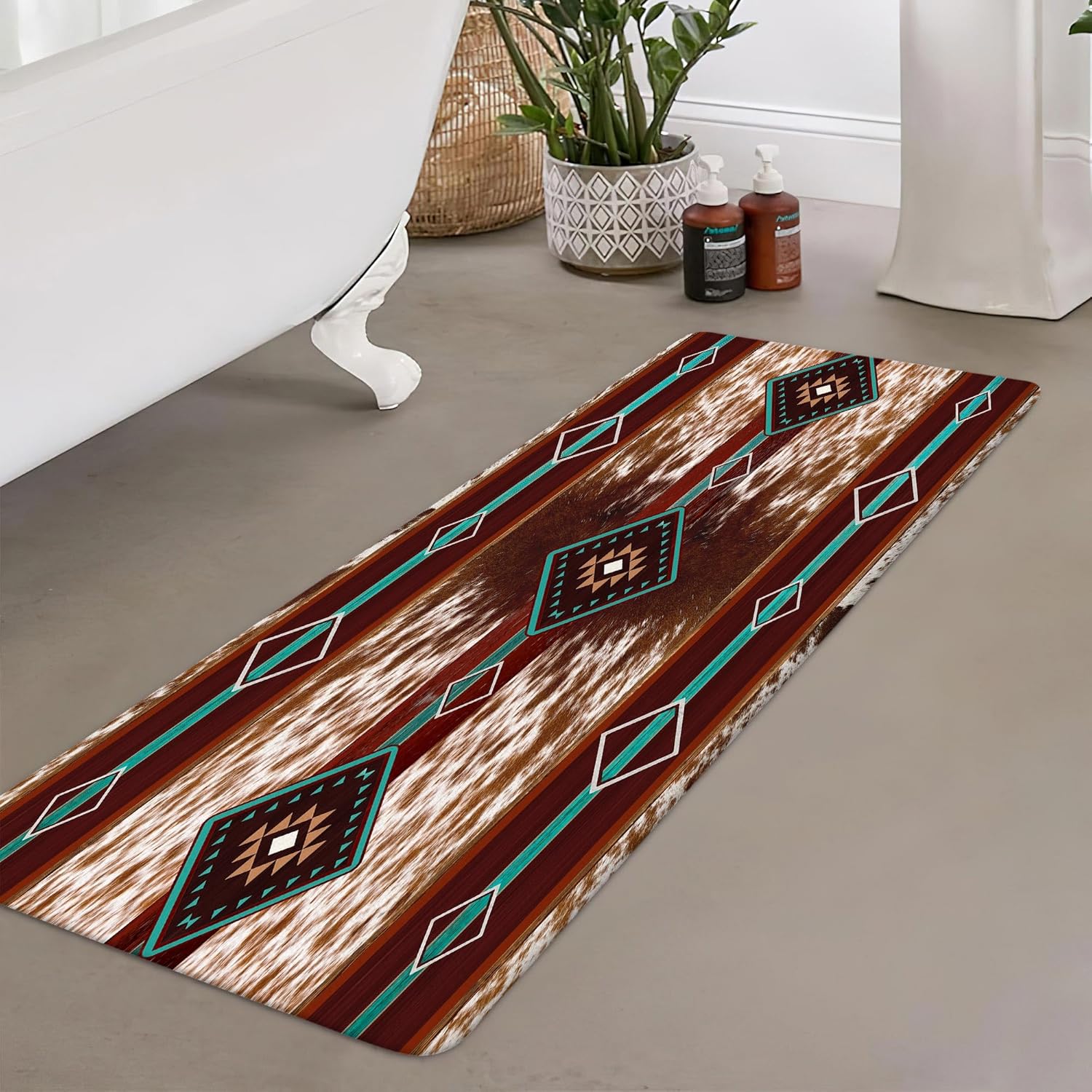 JAWO Western Aztec Bath Mat, Southwest Geometric Pattern Faux Cowhide Red Brown Bathroom Rug, Cow Print Non Slip Bathtub Mat Modern Art Bathroom Accessories Shower Mat Kitchen Rug (17X48)