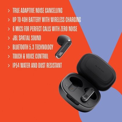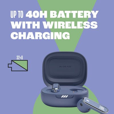 . JBL Spatial Sound. JBL Signature Sound and Personi-Fi 2.0. Hear your music in full color with 12mm neodymium speaker drivers perfectly tuned for on-the-go high-fidelity listening with deep bass and JBL Signature Sound. Then use Personi-Fi 2.0 to optimize your audio experience based on your unique hearing profile. True Adaptive Noise Cancelling. JBL Live Flex combines the all-day comfort of stick-open earbuds with True Adaptive Noise Cancelling. Eliminate noise and distractions with technology that adapts to your surroundings in real time. Up to 40 hours of playtime with Wireless Charging. Life's too short for dead batteries. JBL Live Flex features up to 8 hours of power in the earbuds plus another 32 in the case*. And if your all-day audio companion needs a power-up, Qi-compatible wireless charging delivers an additional 4 hours in just 15 minutes. *with ANC off (24 with ANC on). 6 mics for perfect calls with zero noise. Connect to the world from anywhere. The JBL Live Flex features 6 beamforming mics that reduce noise and ensure your voice comes through loud and clear. JBL Spatial Sound. Surround yourself with your favorite audio. JBL Live Flex immerses you in spatial sound from any two-channel source via Bluetooth® for immersive listening freedom.