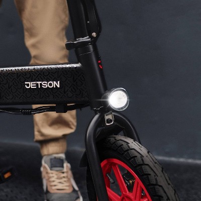Get around town faster and smarter with the Jetson Arro Folding Electric Bike. Its foldable stem and frame make it a super compact option that can easily fit in a car trunk or be stored in a closet at home. A 350-Watt motor will have riders hitting speeds of up to 15.5 mph engage the twist throttle and go while its battery allows for a 15-mile range when using full throttle but go even farther with pedal assist. This item is certified to UL 2849 standards by SGS. Highlights: Folding Electric Bike: The Jetson Arro has a foldable stem and frame. It folds down to a compact size of 28.0 (L) x 17.3 (H) x 22.8 (W) for storage and transport. Top Speed: A 350-Watt motor will have riders hitting speeds of up to 15.5 mph. Twist Throttle: Get there quickly with the Arro s twist throttle. Battery Range: The Arro comes with a 15-mile battery range. Pedal Assist: Ride farther with pedal assist, which gives boosts of power to the pedals as riders cycle. Specifications: Dimensions (Overall): 48.8 Inches (L), 40.1 Inches (H) x 21 Inches (W) Weight: 45.2 Pounds Holds up to: 220 Pounds Material: Steel, Alloy (Frame) Features: Twist Throttle, Headlight, Folds, Adjustable Seat Suggested Age: 14 Years and Up Wheel Material: Rubber Estimated Charge Time: 5 Hours Assembly Details: Adult Assembly Required, Tools Provided Maximum Speed: 15.5 Miles per Hour CPSC Choking Hazard Warnings: Choking_hazard_small_parts Includes: Seat, Rechargeable Battery Industry or Government Certifications: UL2849 Certified Wheel Diameter: 14 Inches Cruising Range: 15 Miles Maximum Battery Charge Life: 5 Hours Bicycle Frame Type: Step-Over Battery: 1 Non-Universal Lithium Ion, Required, Included