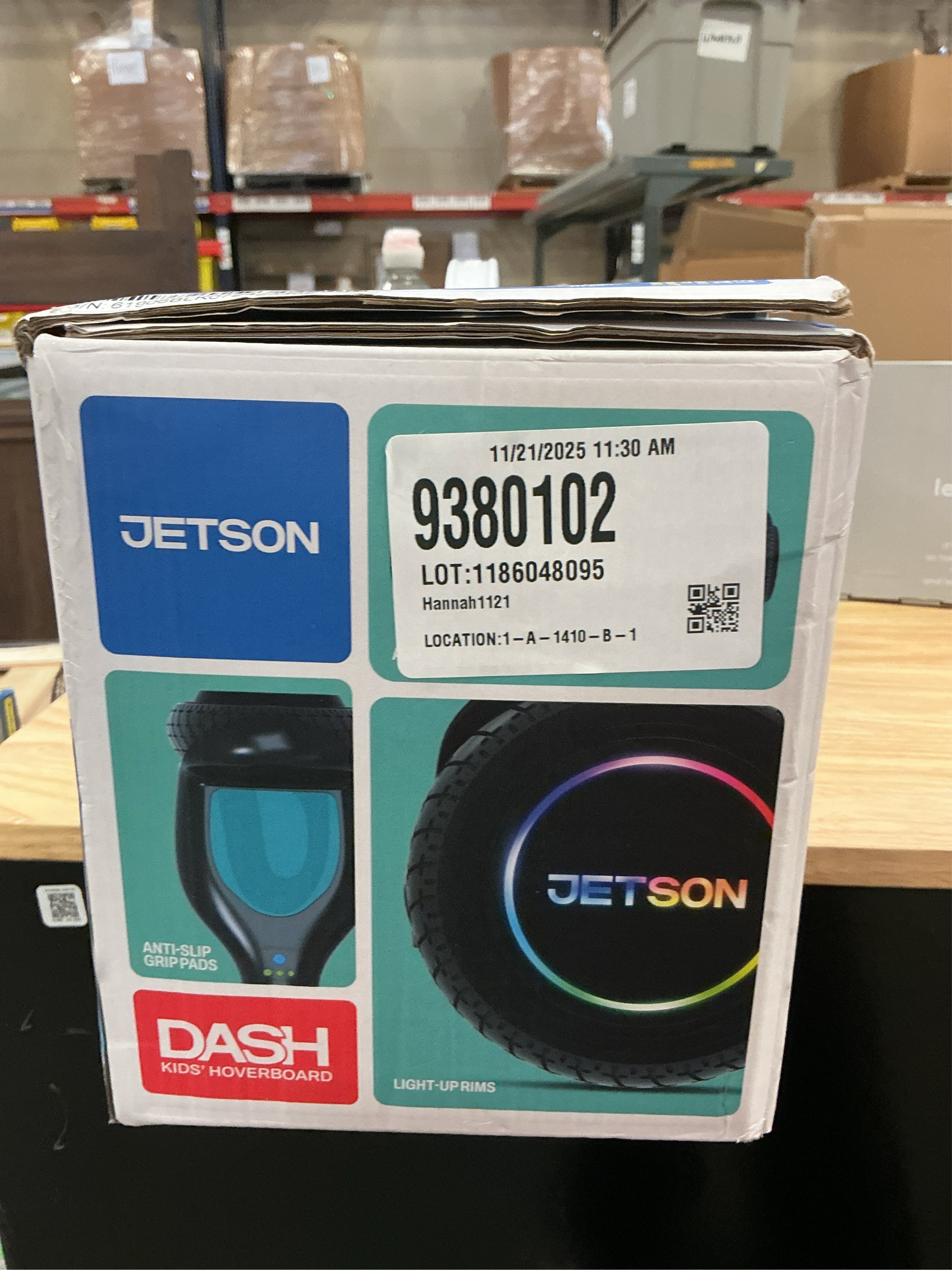 Younger kids who watch in awe as tweens and teens coast past them on hoverboards now have one they can hop on themselves. The Jetson Dash was made for them – scaled down in size and speed, so they can feel comfortable and confident while they learn. They’ll feel fully supported by the substantial, durable tires and the active-balance technology that helps keep them stable. Anti-slip standing pads over the movement sensors help their feet stay in place while they get a hang of how to make the hoverboard go. And the max speed of 5 mph is just right to thrill them while still feeling manageable. It won’t be long before they’re spinning, swerving – and showing off their moves. They will be glowing with excitement – matching the beams of multicolor lights radiating from within the wheel rims. Riders get up to 40 minutes of runtime before it’s time to recharge. The Jetson Dash is recommended for riders ages 6 and up.This item is certified to UL 2272 standards by UL Solutions.https://www.nyc.gov/assets/fdny/downloads/pdf/codes/lithium-ion-batteries-safety-tips-retailers-consumers.pdf