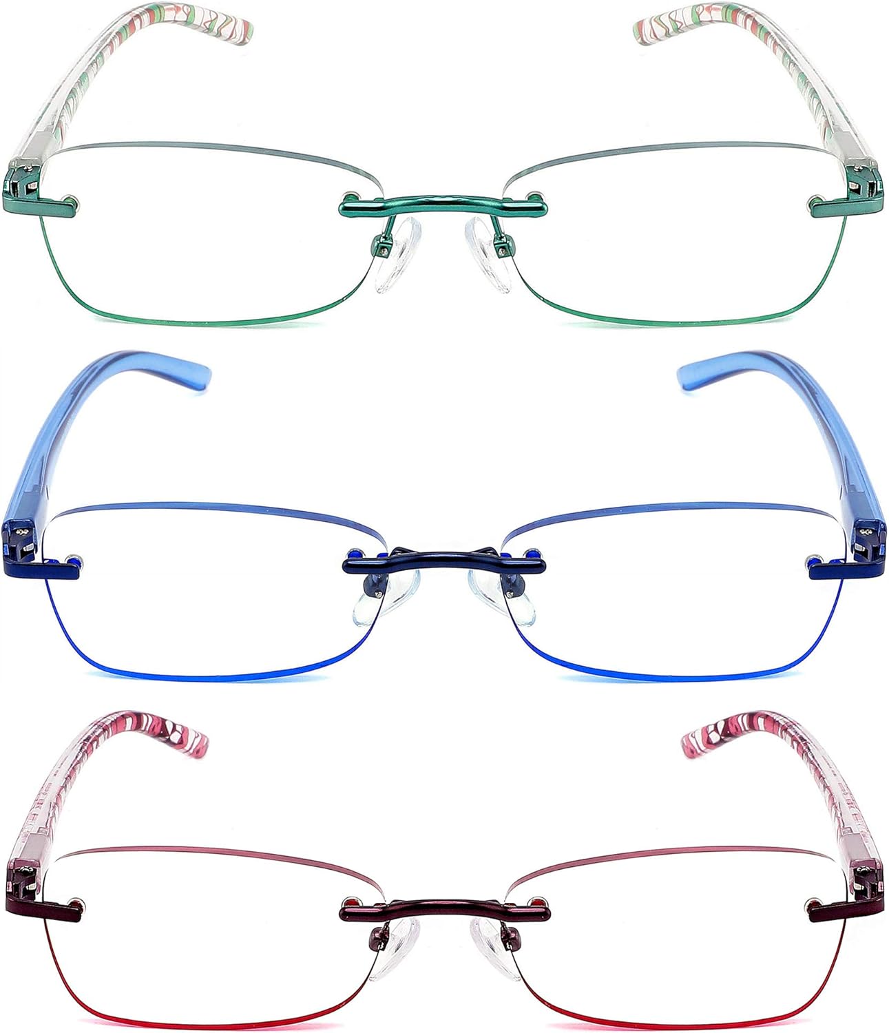 JJWELL 3 Pack Blue Light Blocking Reading Glasses for Women, Anti Eyestrain/Computer Glare UV 400 Filter Readers with Spring Hinge, Lightweight Rimless Tinted Metal Blue Rays Eyeglasses (3.00)
