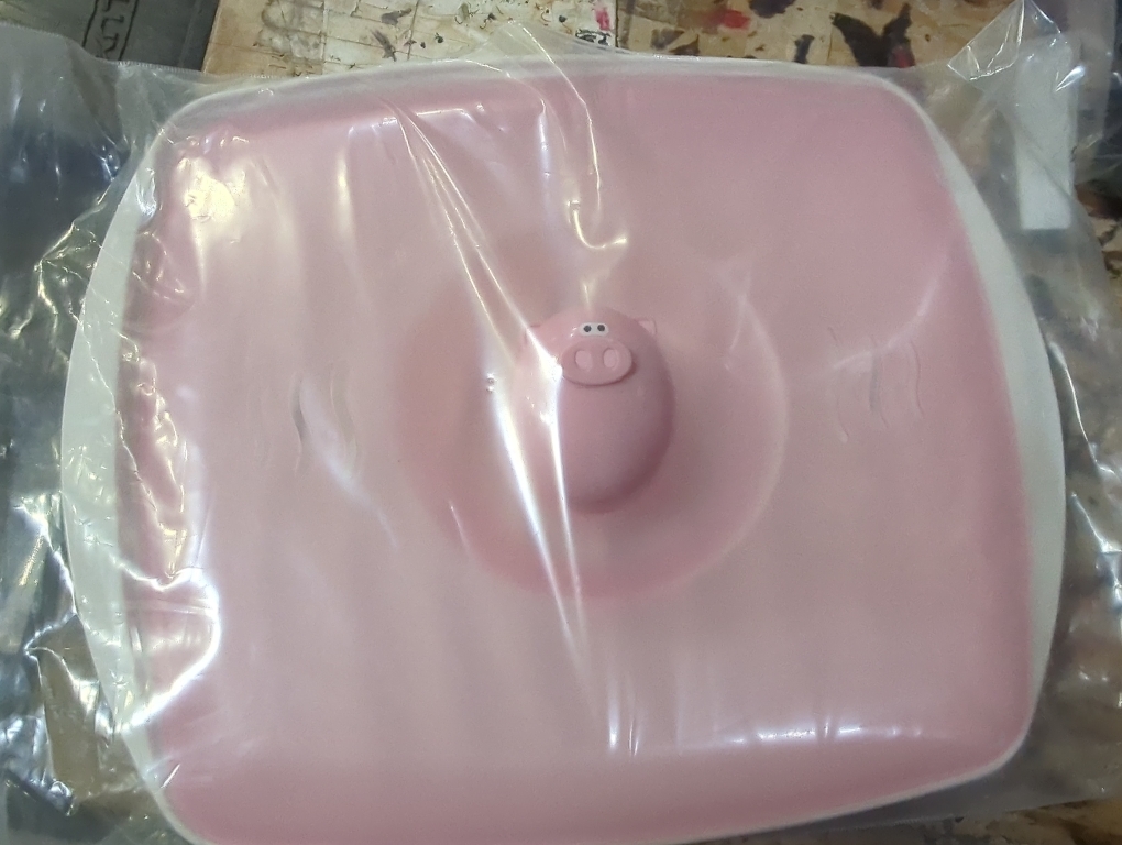 CONTAINS: (1) pig-themed microwave bacon tray with splatter lid