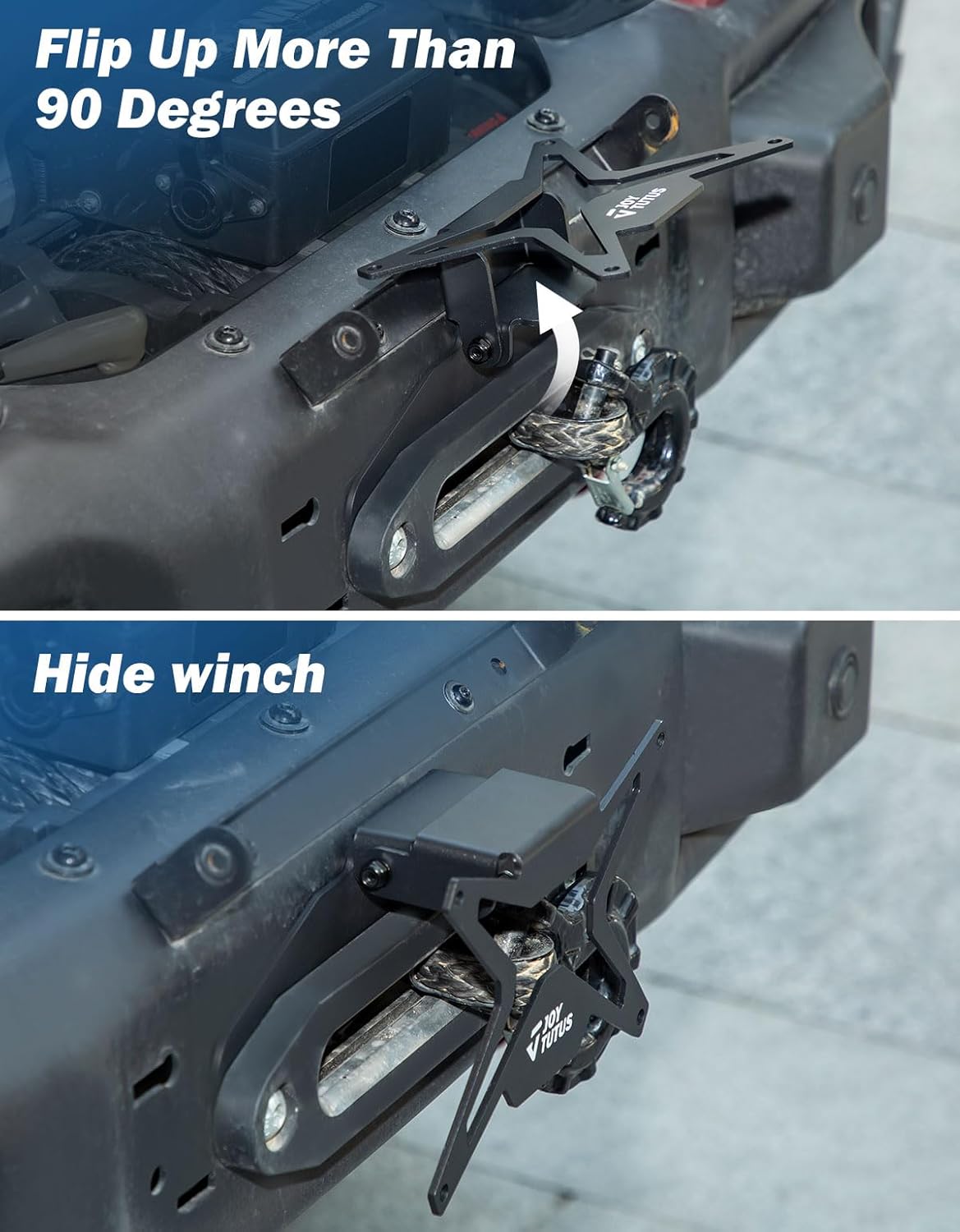 【 Hawse Fairlead Is Compatible】The fairlead license plate holder's new design allows for compatibility with chain fairleads and aftermarket winch hooks. This hawse fairlead flip-up license plate mount is ideal for vehicles equipped with a winch, making it a great choice(Not fit with roller)