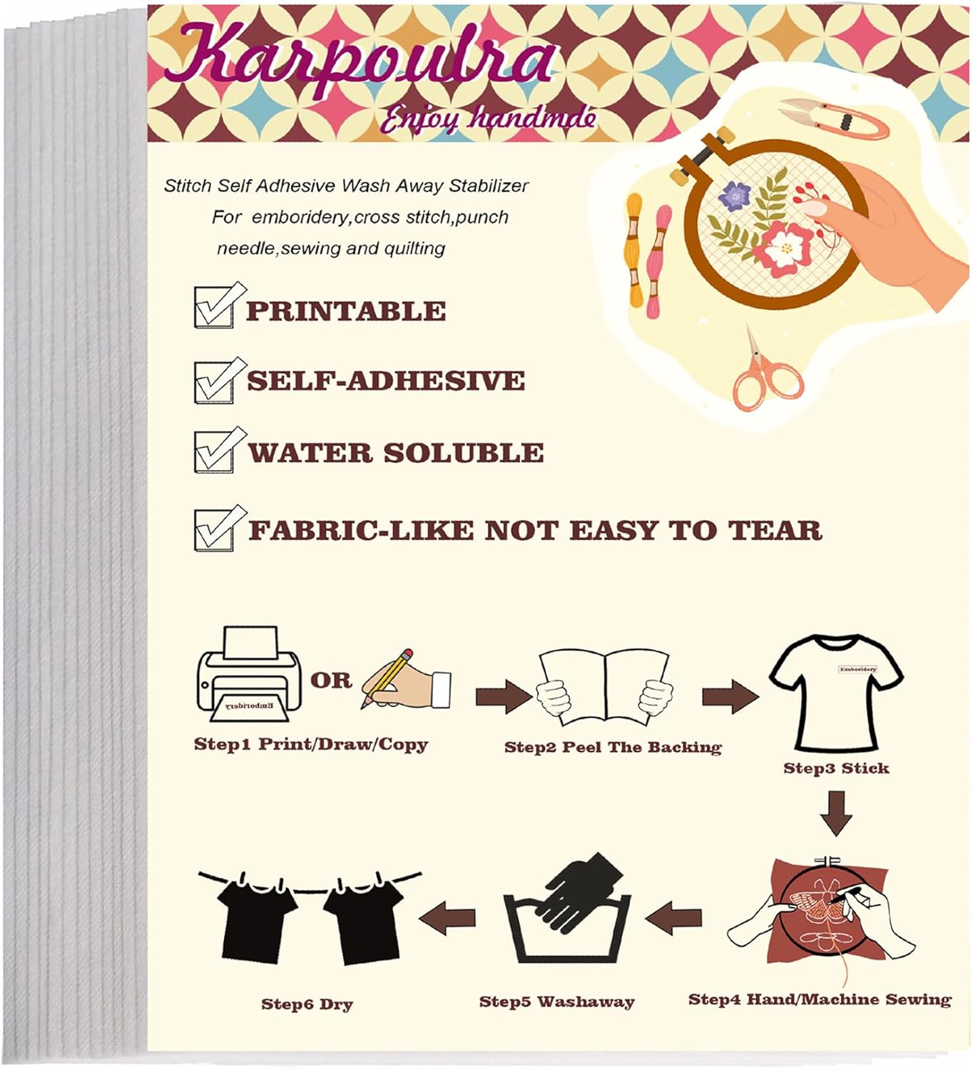 Karpoulra 6 Sheets 8.5"x11" Sticky Water Soluble Embroidery Stabilizer, Dissolvable Printable Self Adhesive Wash Away Stabilizer for Print or Draw Patterns Hand Machine Embroidery