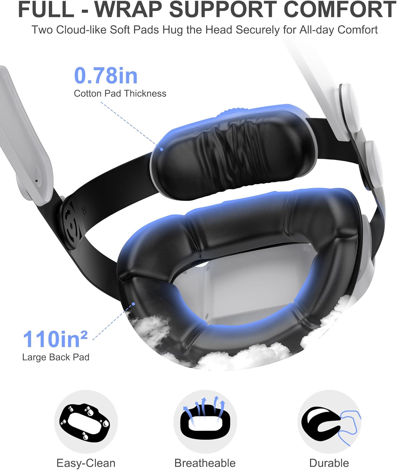 【All-Day Comfort - Dual Cotton Pads】Maximum comfort and support with two thick and soft cotton pads. This VR head strap design for oculus/meta quest 3s/3/2 accessories to extend comfort, 110in² oversized cushion rear pad engineered for weight distribution to enhance stability & safety during intense VR workouts.