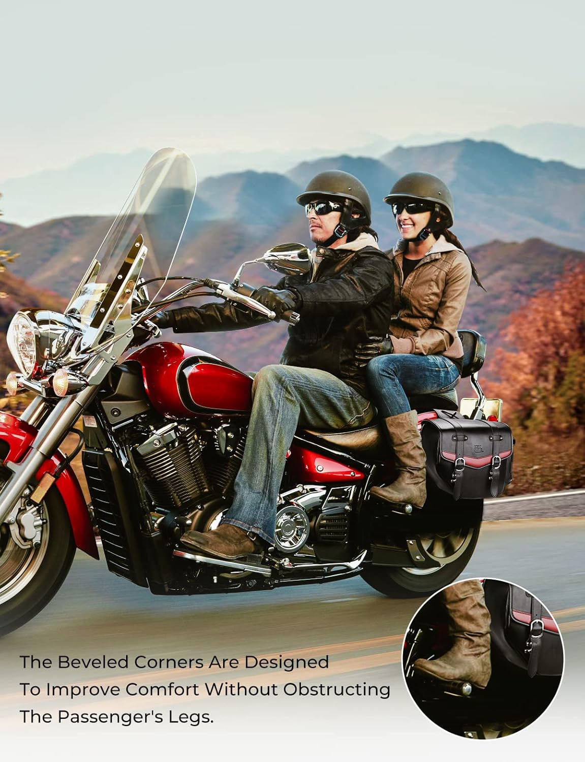Improve passenger comfort :These motorcycle upgraded saddlebags are universal and fit many motorcycle models including but not limited to Softail Dyna Road King V-star, Shadow, and Vulcan. Feature a unique design with beveled corners that ensure passenger leg space remains unobstructed. This not only enhances the comfort of rear seat passengers but also eliminates the risk of fatigue