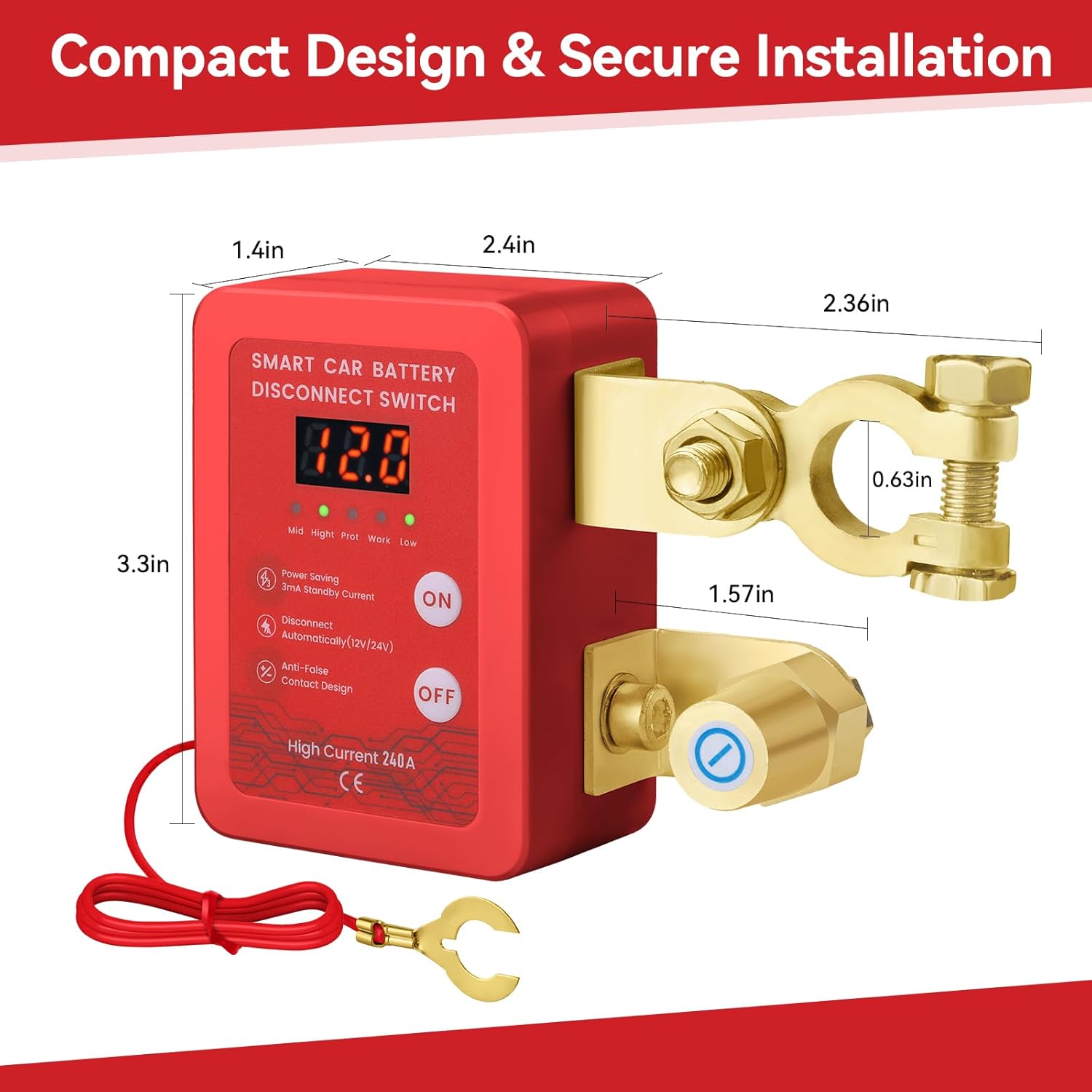 Kill Switch for Car - Remote Battery Disconnect Switch 12v, 240A, Upgrade Smart Voltage with LED Screen, Anti-Theft, Prevent Battery Drain (red)