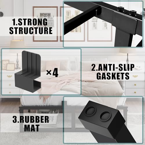 Heavy Duty Bed Frame:The king size bed frame is made of alloy steel with reinforced legs designed to prevent structural distortion and support up to 3500 lbs of weight Non-slip Design:The steel slats comes with four strips of tape to effectively reduce mattress slippage.The foot plug added to the bottom of the bed frame support foot prevents the bed frame from sliding and protects your floor from being scratched Easy Assembly:All assembly tools and instructions are packaged with the twin size bed frame,and it takes 15 minutes to complete the installation according to the instructions No Box Spring Needed:The bed frame with strong and durable steel slats will support and extend the life of your latex,memory foam or innerspring mattress without the need for a box spring.Steel slats with four strips of tape effectively reduce mattress slippage Under-bed Storage:18-inch high king bed frame with 16-inch high storage space under the bed.Provides convenient storage space for your out-of-season clothes,shoes,etc