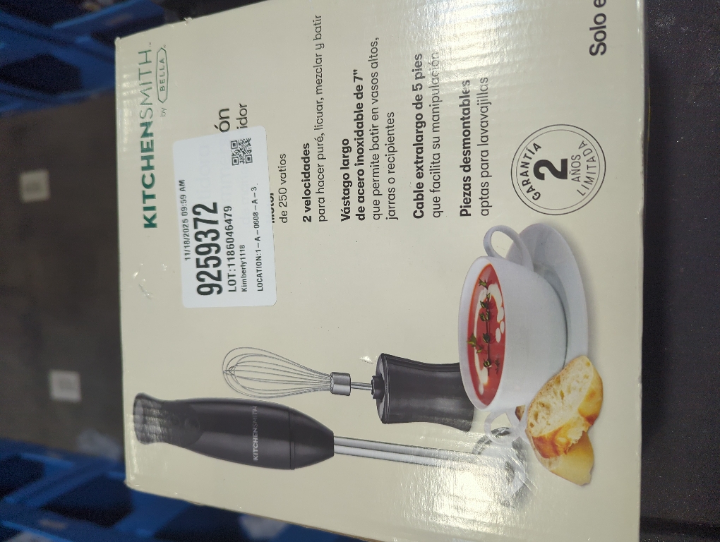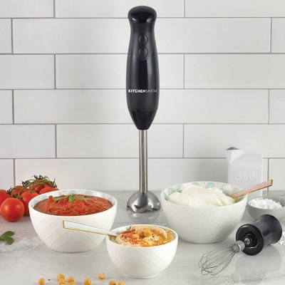 Meet the do it all blending hero! The KitchenSmith Immersion Blender can prepare smoothies, soups, sauces, whipped cream, mayonnaise, and even meringue. Perfect for the kitchen that doesn't have space for larger blenders. It's durable stainless steel blade, versatile whisk attachment and 250 watt motor will "wow" you with what it can do. Easy to clean with dishwasher safe parts.