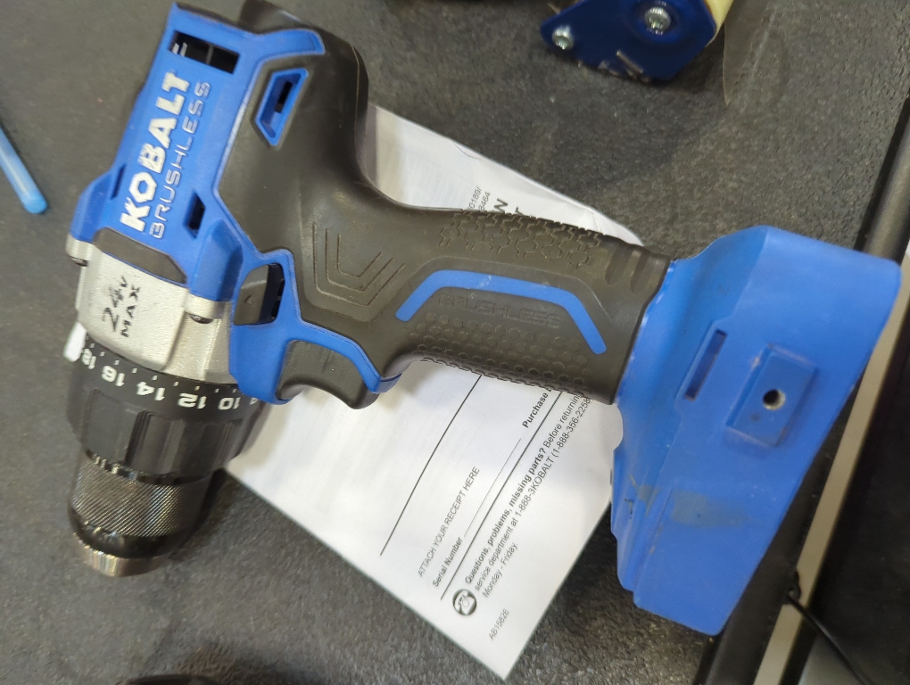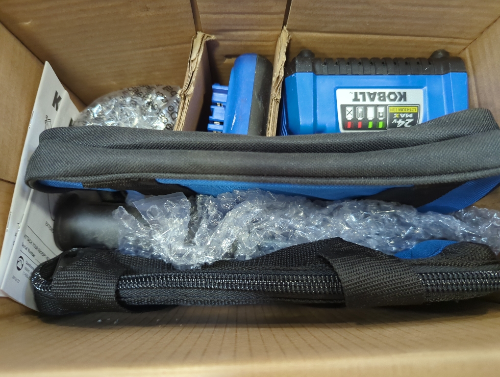 Kobalt 24-volt max 1/2-in cordless drill/driver comes with a 24-volt max 2.0Ah Li-ion battery, charger, belt clip, double-ended driver bit, bit holder, auxiliary handle and soft bag