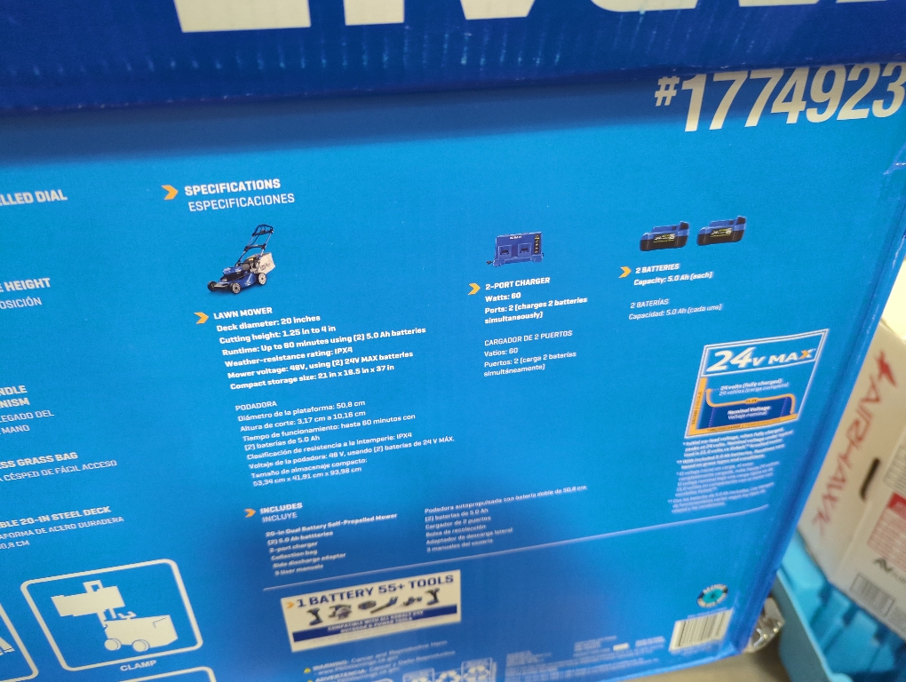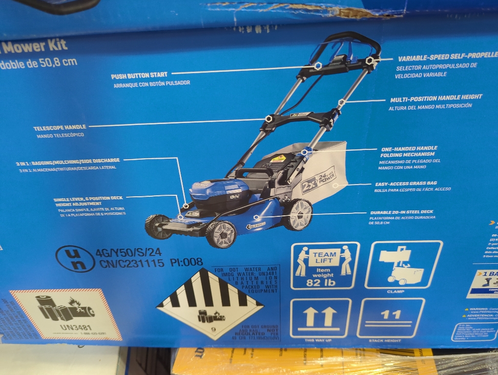 The Kobalt 2x24V (48 Total Volts) Brushless Motor Self Propelled Lawn Mower provides superior performance without the noise, mess, and fumes of gas. The 2x24V=48 Total Volts mower offers versatility with 3-1 cutting modes along convenient push button start. Offering up to 50-minutes of cut time, the 2x24V mower has you covered. The included batteries and charger are compatible with all Kobalt 24-volt max tools and are backed by a Brushless motor provides maximum performance power (2x24V = 48 Total Volts) 2x24-Volt = 48 total volts platform is compatible with all current Kobalt 24-Volt Max Tools and Outdoor Power Equipment 20-In steel deck offers long lasting durability 3-In-1 mulching/bagging/side discharge offers versatility for any mowing style Self propelled rear wheel drive, with variable speed control, for maximum control and handling One-handed telescopic folding handle allows for convenient vertical storage Single-lever, 6-position deck height adjustment to quickly adjust for your preferred grass height Push button start for easy operation Includes 2 (5.0Ah) batteries and dual port charger Battery Voltage: 48-volt Series Name: 2x24 Type: Self-propelled lawn mower Assembled Weight (lbs.): 58 Cut Height Adjustment: 6-position Cut Width (Inches): 19.5 Cutting Range/Yard Size (Acres): Up to 1/4 acre Front Wheel Size: 7-in Maximum Cutting Height (Inches): 4 Minimum Cutting Height (Inches): 1.25 Mower Deck Width (Inches): 20 Package Weight (lbs.): 75 Rear Wheel Size: 9-in Adjustment Type: Single-lever Bagger Included: Yes Battery Amp Hours: 5.0 Battery Included: Yes Battery Run Time (Minutes): 50 Battery Type: Lithium ion Blade Stop System: No Brushless: Yes Charge Time (Hours): 3 Charger Included: Yes Collapsible: Yes Discharge Location: Rear Drive Type: Rear wheel drive Handle Adjustments: 3 Leaf Bag Included: Yes Lowe's Exclusive: Yes Mulching Capable: Yes (included) Number of Batteries Included: 2 Power Source: Battery Recommended for Terrain Type: Flat with obstacles Refurbished: No Removable Battery: Yes Self-Propelled: Yes Start Type: Push button start Vertical Storage: Yes