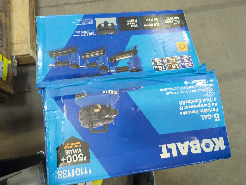 This air compressor is equipped with a pancake style tank, 1.0 HP maintenance free universal motor, 2.6 CFM at 90 PSI air delivery, 150 max. PSI working pressure, two durable quick couplers, an easy to operate drain valve. It can be easily operated with extension cord, no need to worry about low-voltage start issue. It is perfect for trimming and finishing jobs. It also features a strong handle and light weight design, you can easily carry it everywhere to get job done. This kit includes: 6-Gallon Air Compressor, 16 Gauge Finish Nailer, 18 Gauge Brad Nailer, 23 Gauge Pin Nailer, and 25 Air Hose.