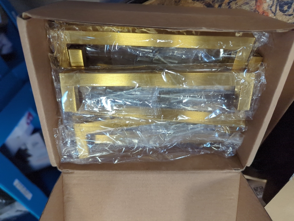 Pack of 10 brushed gold square bar cabinet pull handles, solid metal hardware.