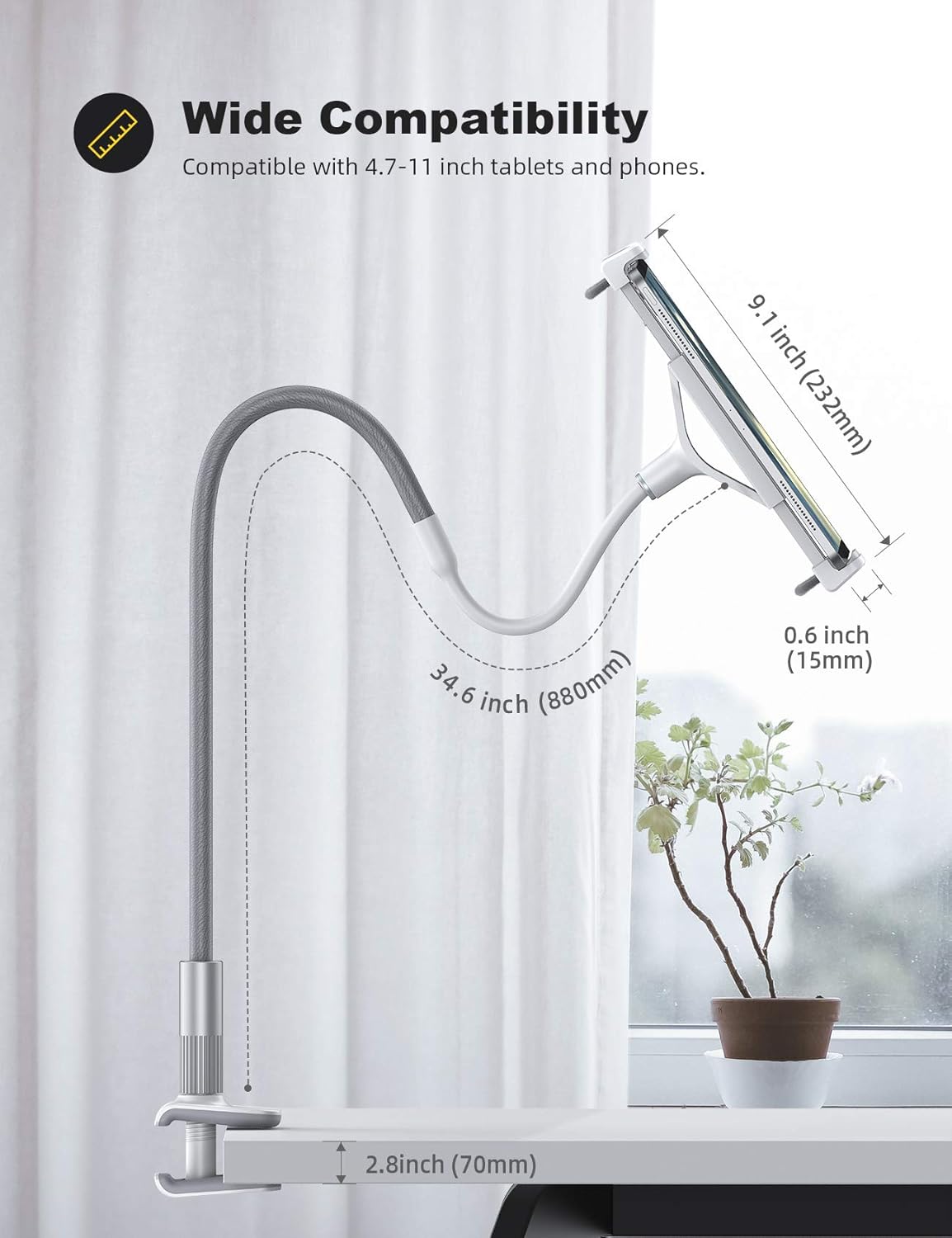 【Broad compatibility】this ergonomic gooseneck tablet holder, compatible with all 4.7 - 10.5 inch cell Phones and tablets, such as 2024 / 2022 iPad Pro 11, 10.9, ipad 10th generation, iPad Air 6 5 4 3, iPad mini 2 3 4 5 6, iPad Pro 9.7, 10.5, 2021 iPad Pro 11, iPhone Air 17 Pro Max, iPhone 16 Pro Max, iPhone 15 Pro Max, iPhone 14 Pro Max, iPhone 13 Pro Max, iPhone 12 Pro Max, iPhone 11 Pro Max, Galaxy Tab A8 A7, Galaxy Tab S8 S7, Galaxy Tab E, Switch, Kindle scribe.