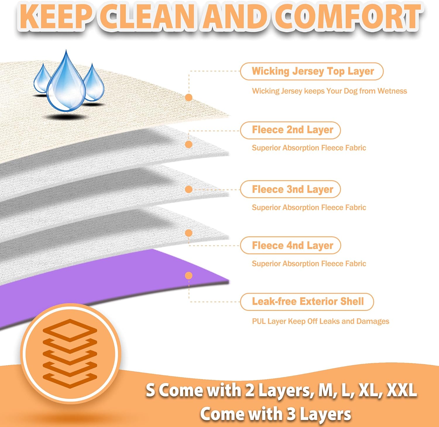 Absorbent & Leak-free Materials - The reusable female dog diaper inner layer is made of soft and breathable beige color wicking jersey, perfect to keep the dog from wetness. The 8 middle layers are made of highly absorbent fleece to absorb the liquid and stop any leaks.The diaper outer layer, with attractive and fun designs, is made of smooth and soft-to-touch leak-free TPU material to keep the floor or bed dry and clean.