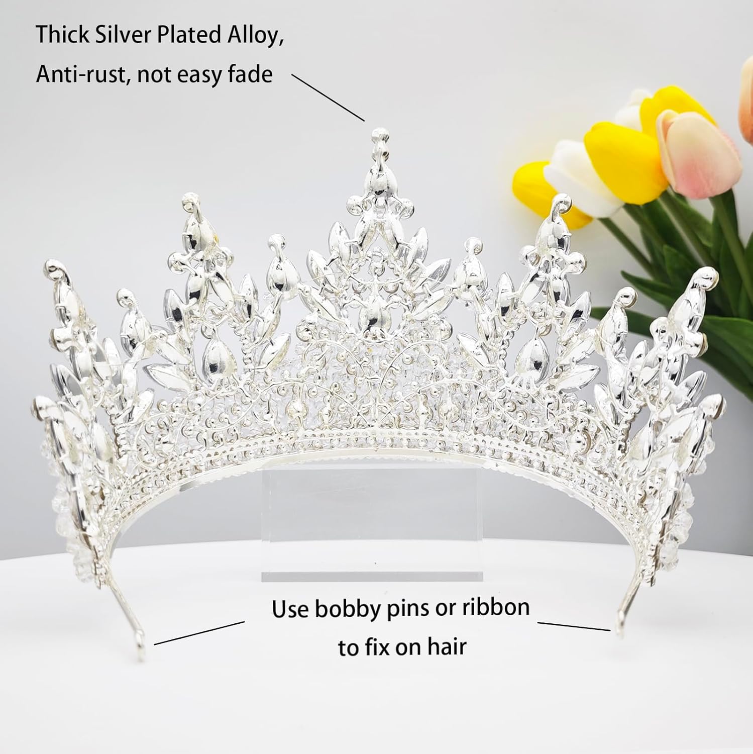 Securing: Sparkly bridal crowns for wedding is semicircle design. Pin loops at each end of the tiara for extra security. (Bobby pins included)