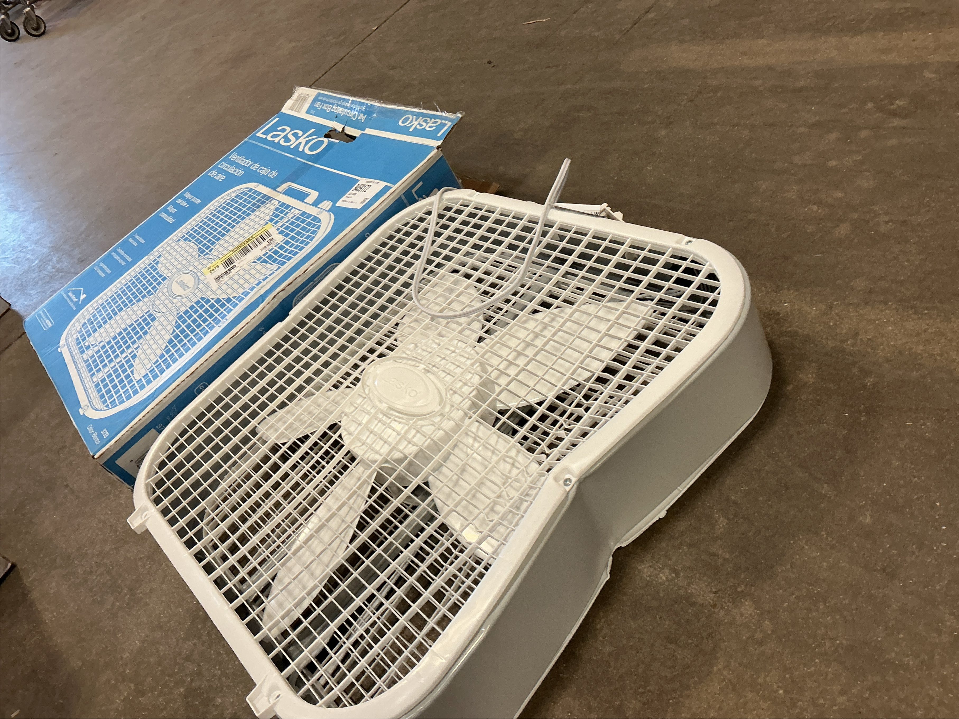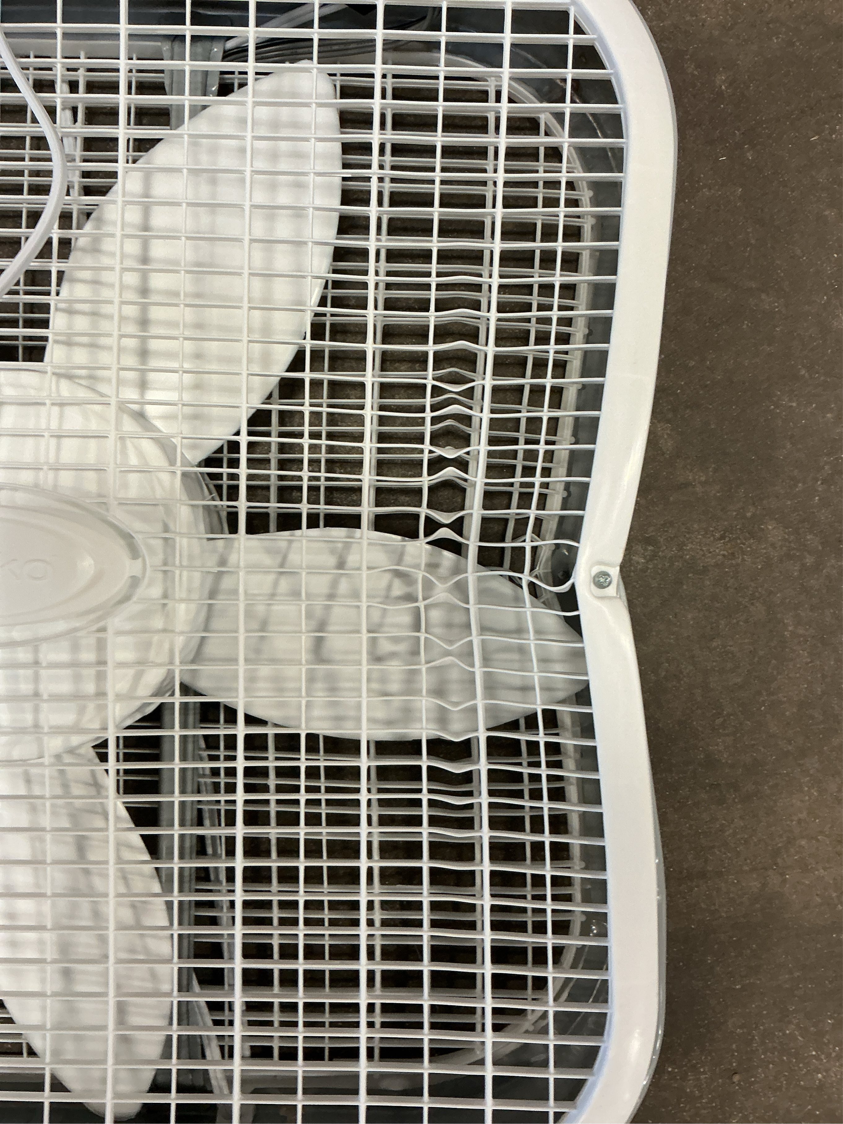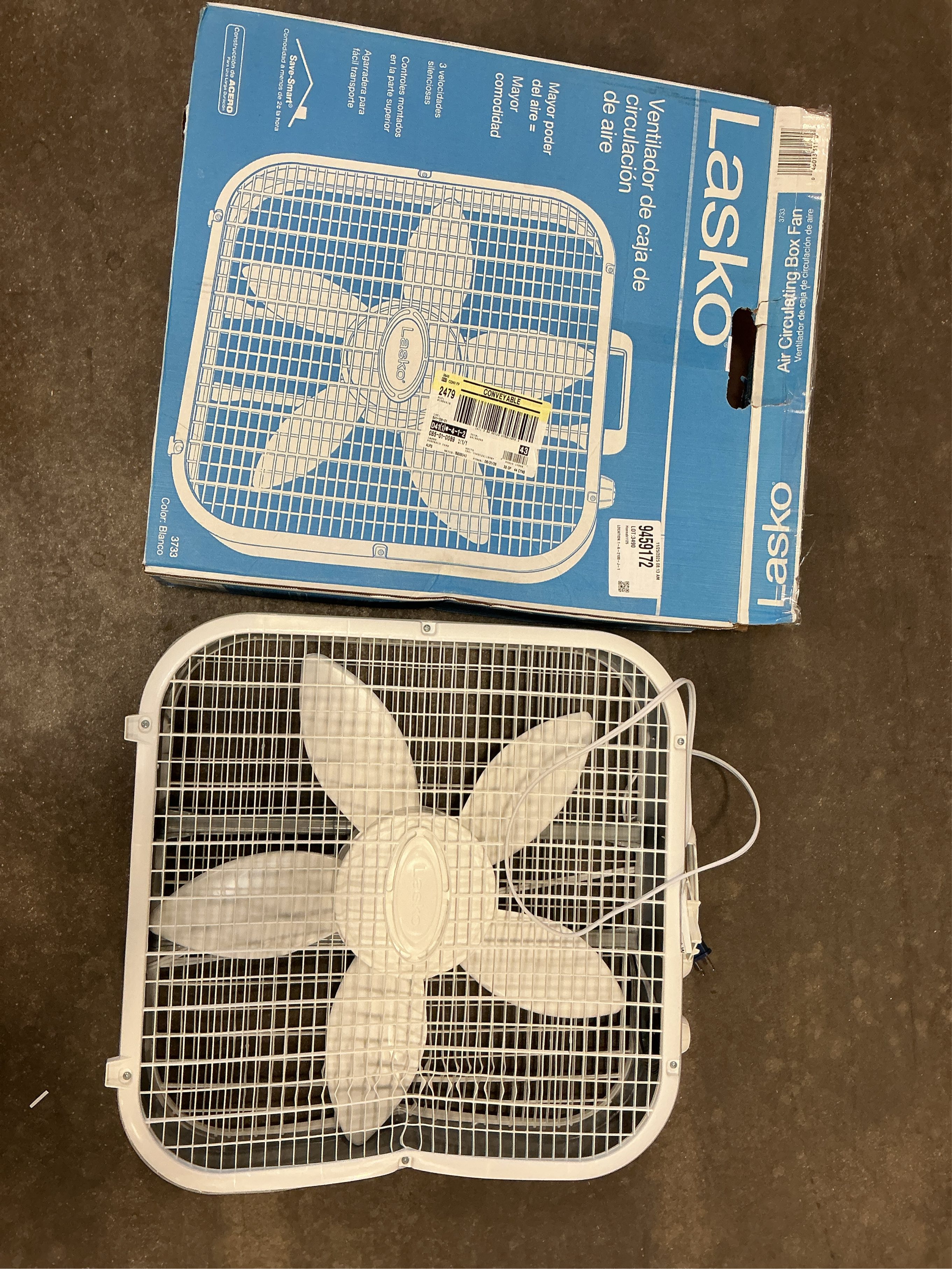 FAN HAS A DENT The Lasko Slim 20" Box Fan features three quiet speeds for high volume air movement. The rounded corners offer provided safety while the slim design allows for easy placement no matter where you put it. Put it in a window, on the floor in a bedroom, living room, office or anywhere you need a fan. Use in conjunction with an air conditioner to boost cooling airflow. Plus, with the Save-Smart design, this fan costs less than 2-cents per hour to run! Equipped with Lasko's trusted, fused safety plug. Simple no-tools assembly required.