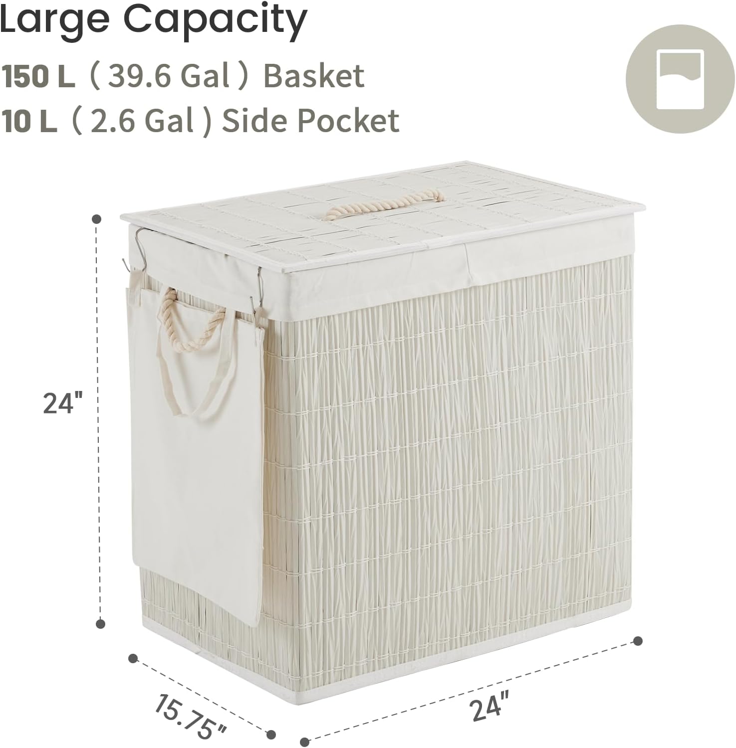 Laundry Hamper with Lid, 42.3 Gallon (160L), Handwoven Rattan Laundry Basket, 3-Section Clothes Hamper with Handles, 2 Removable Liner and Side Pocket, White