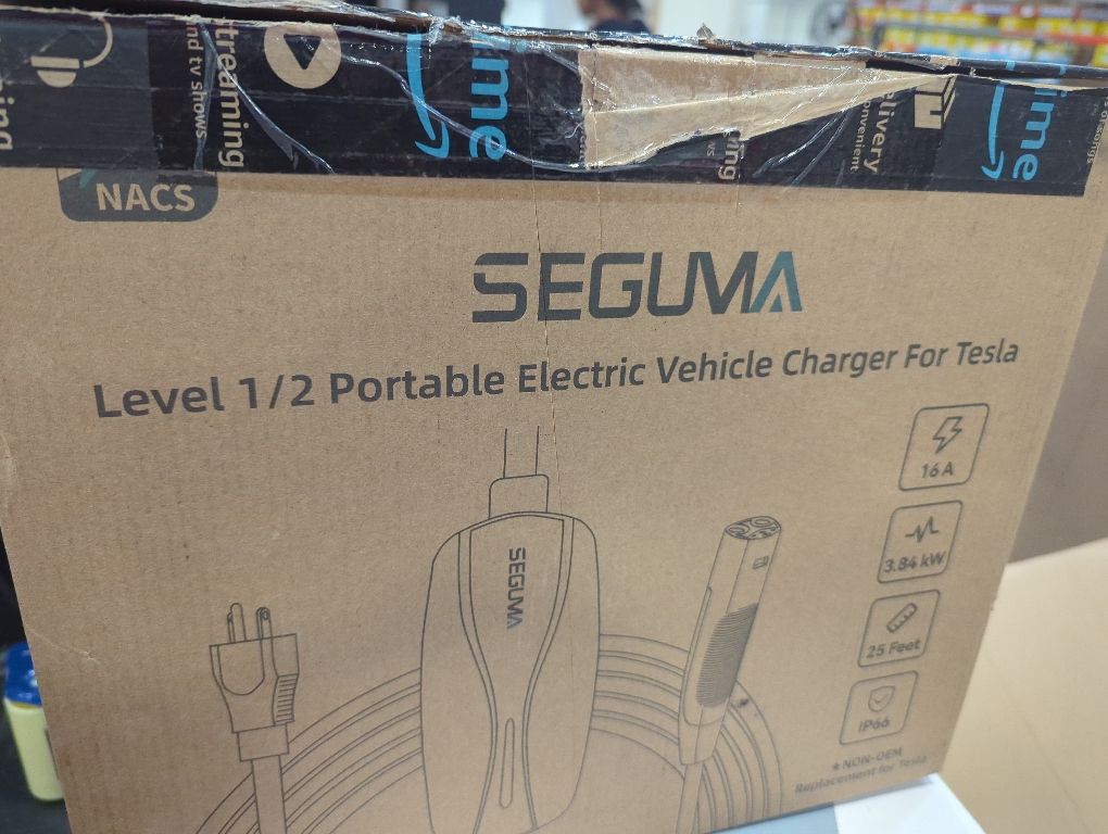 new damaged box Level 1 Level 2 EV Charger for Tesla-The Seguma level 1 NACS car charger includes a NEMA 6-20 plug for Level 2 charging (240V, 16A, 3.68kW, 9-12 miles/hr) and a NEMA 5-15 adapter for Level 1 charging (120V, 12A, 1.44kW, 3-5 miles/hr)