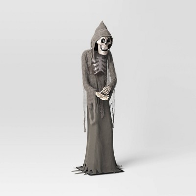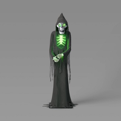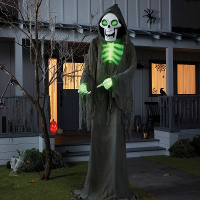 Create a shocking surprise for trick-or-treaters with the 8-Foot Light Up "Bruce" Reaper Outdoor Halloween Decorative Prop from Hyde & EEK! Boutique™. This tall reaper decorative prop has a skull face and comes wearing a black gown and hood for creepy style. The prop has glowing eyes, rib cage and hands for scary appeal. Made with plastic, this light-up decorative prop is great for an outdoor space.Hyde & EEK! Boutique™: Thrilling delights. Curious oddities.