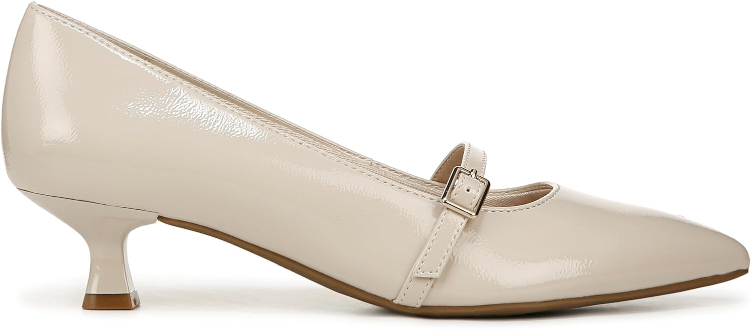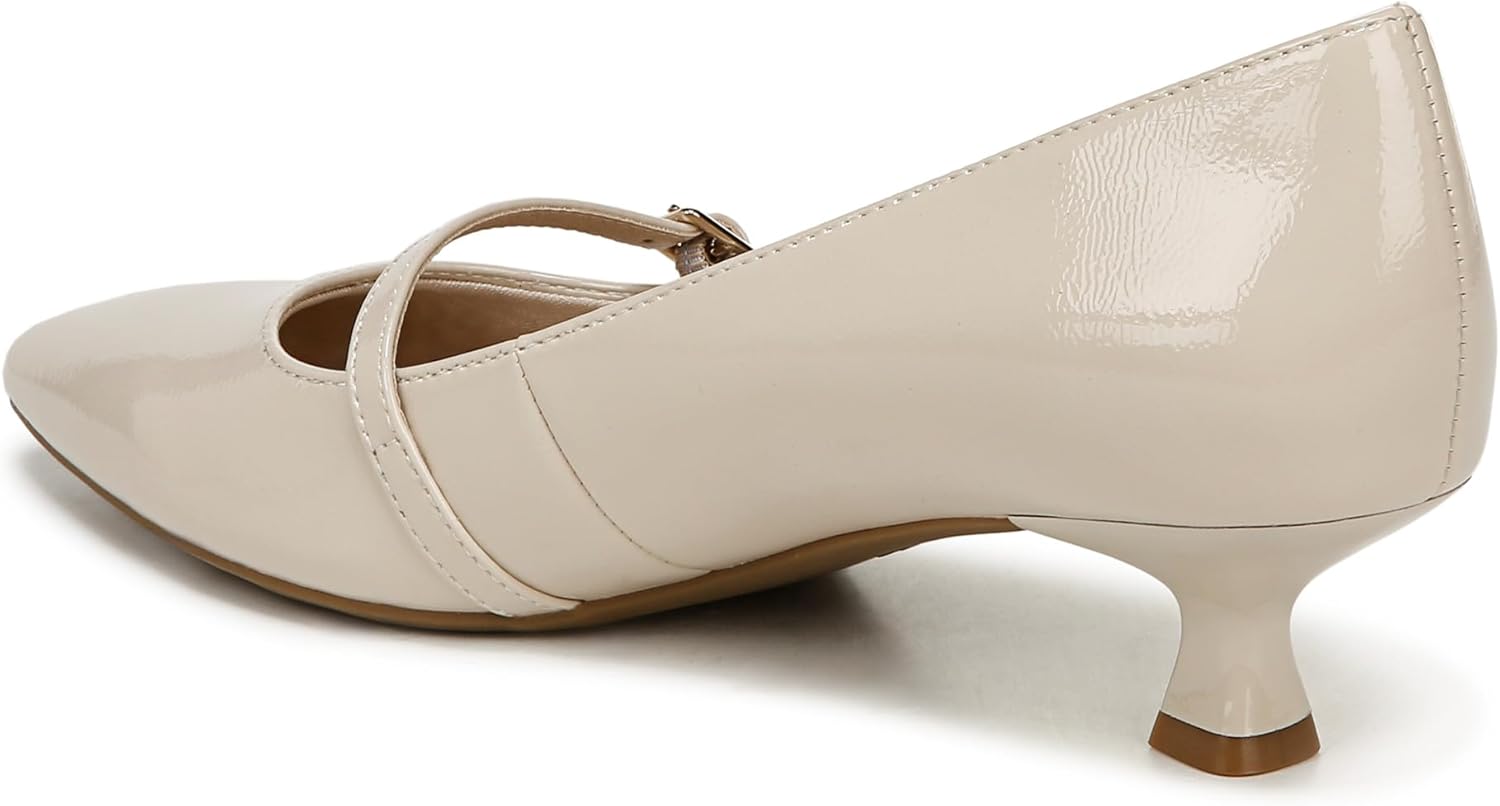 Faux leather upper with a softly pointed toe, Mary Jane strap with buckle detail, and sculpted heel.