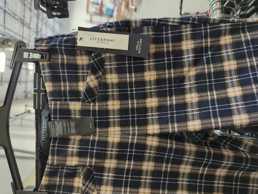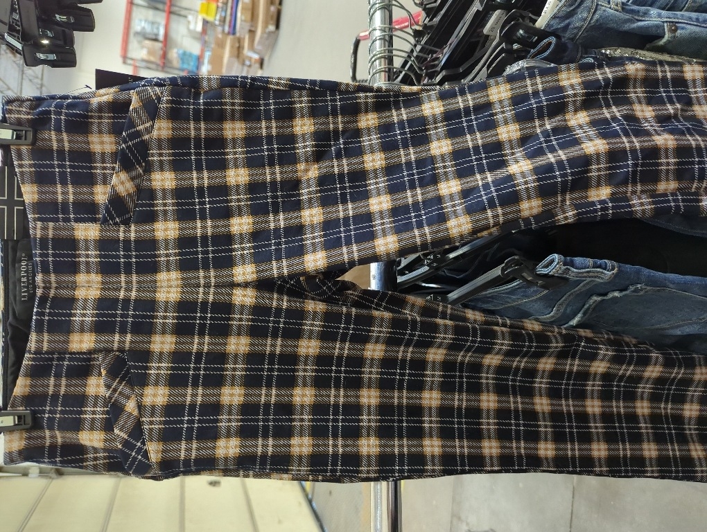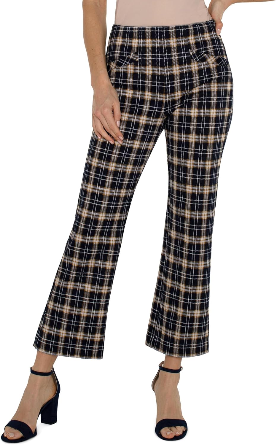 Accentuate a sleek style statement wearing the Liverpool Los Angeles Stella Pull-On Mid-Rise Kick Flare Plaid Jacquard Knit Pants. The knit pull-on style pants are designed with a mid-rise waist, front slanted welt pockets, attractive plaid pattern,