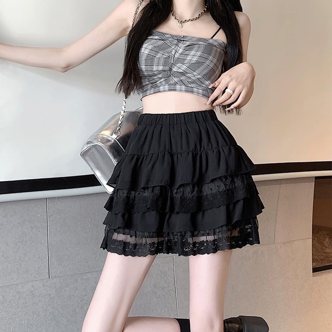 Design: Kawaii harajuku fashion elastic waist tiered short skirt, with layered mesh lace hem decor. Lolita skirt for women, girls and teens.