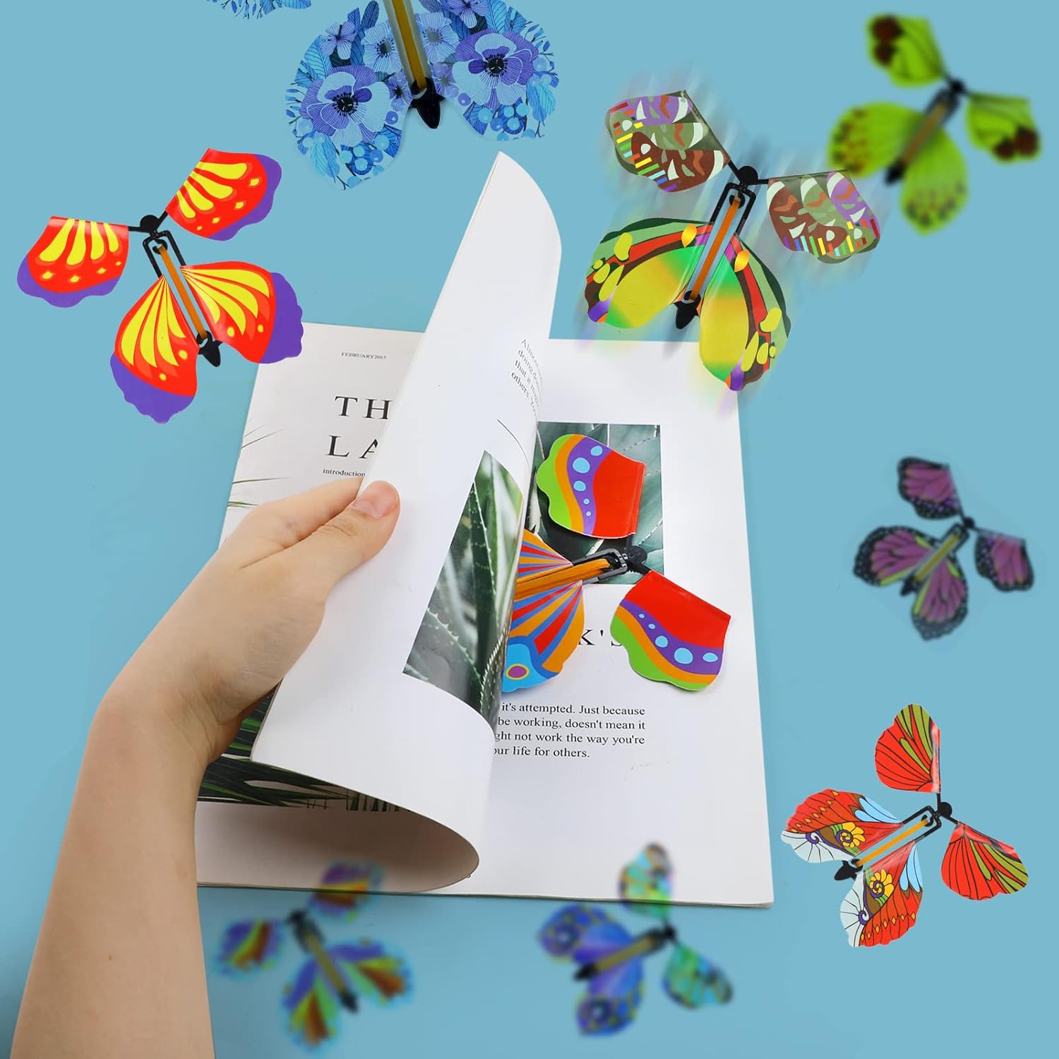 Easy to use:Hold the tail of the flying paper butterflies first, then rotate the butterfly head about 30-50 times to make the rubber band spins tight, finally release it to fly. You can also put them in the book, card, explosion box to make a great surprise.