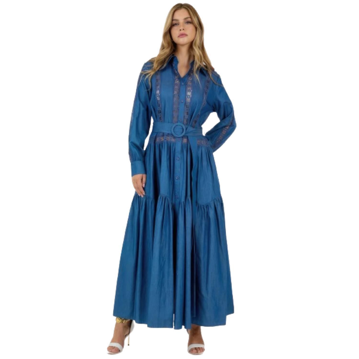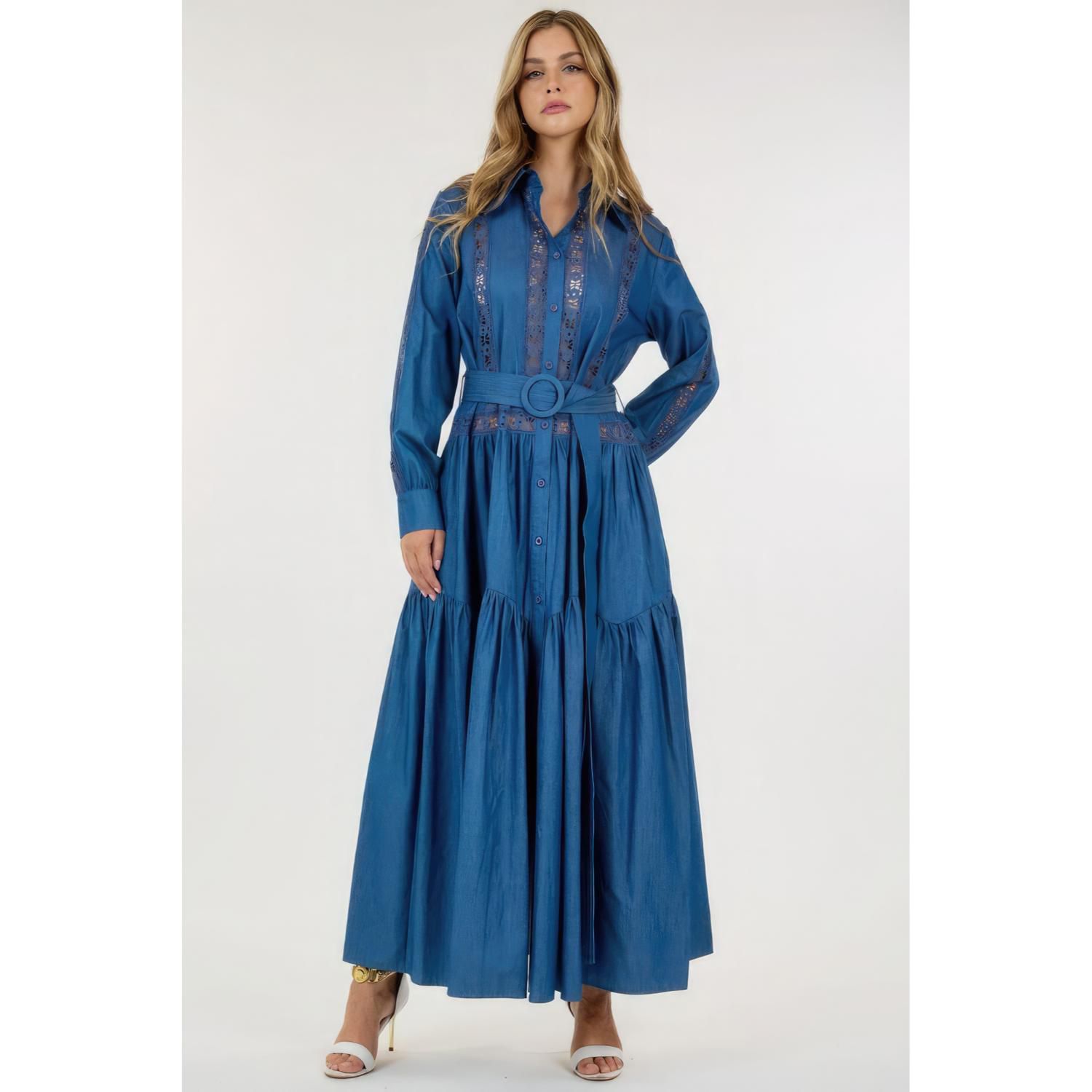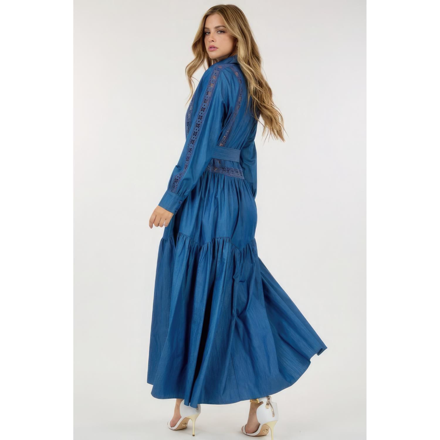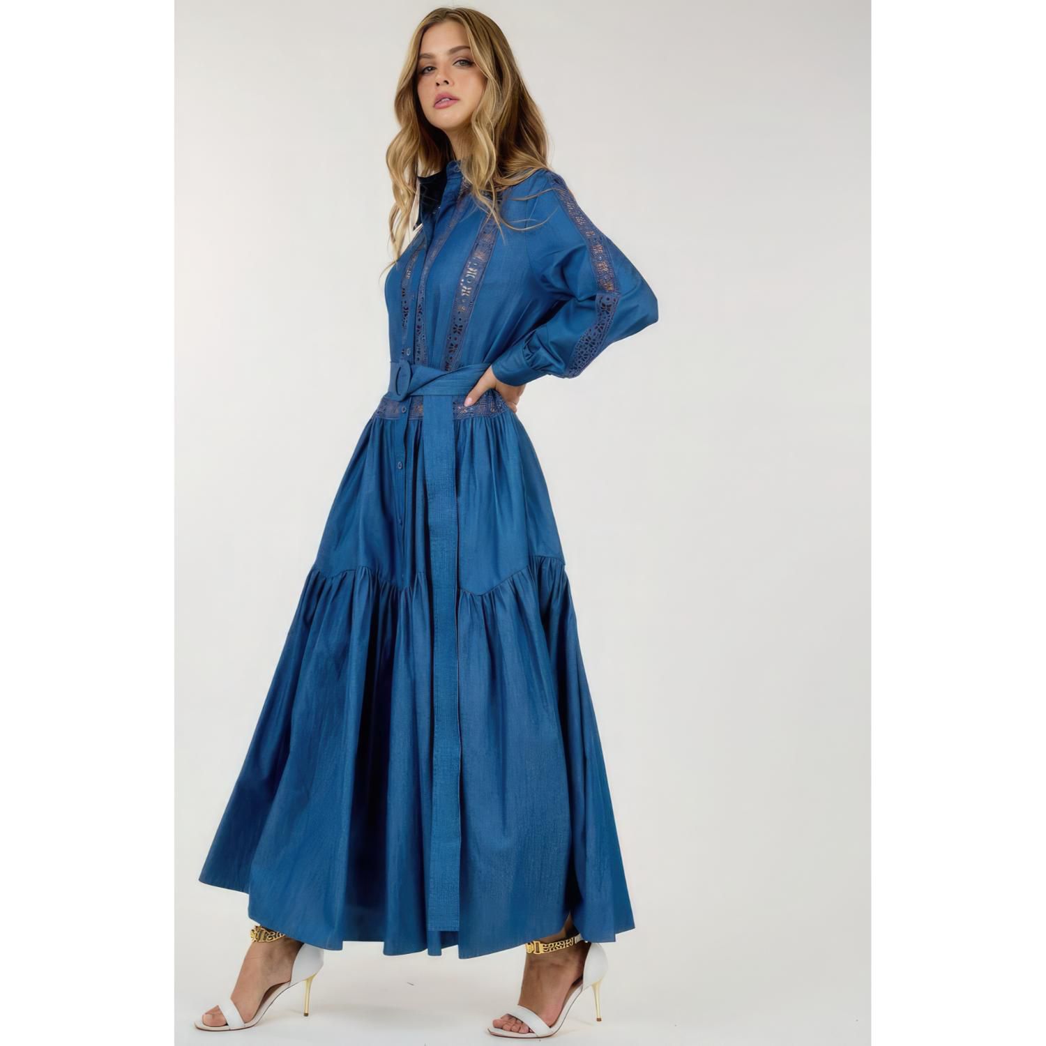 Elevate your wardrobe with our Long Sleeve Maxi Dress, a perfect blend of sophistication and style. This dress offers a refined look with long sleeves for both fashion and coverage, while the see-through lace detail adds a unique and elegant touch. The included belt not only allows for customization but also cinches the waist, creating a flattering silhouette.