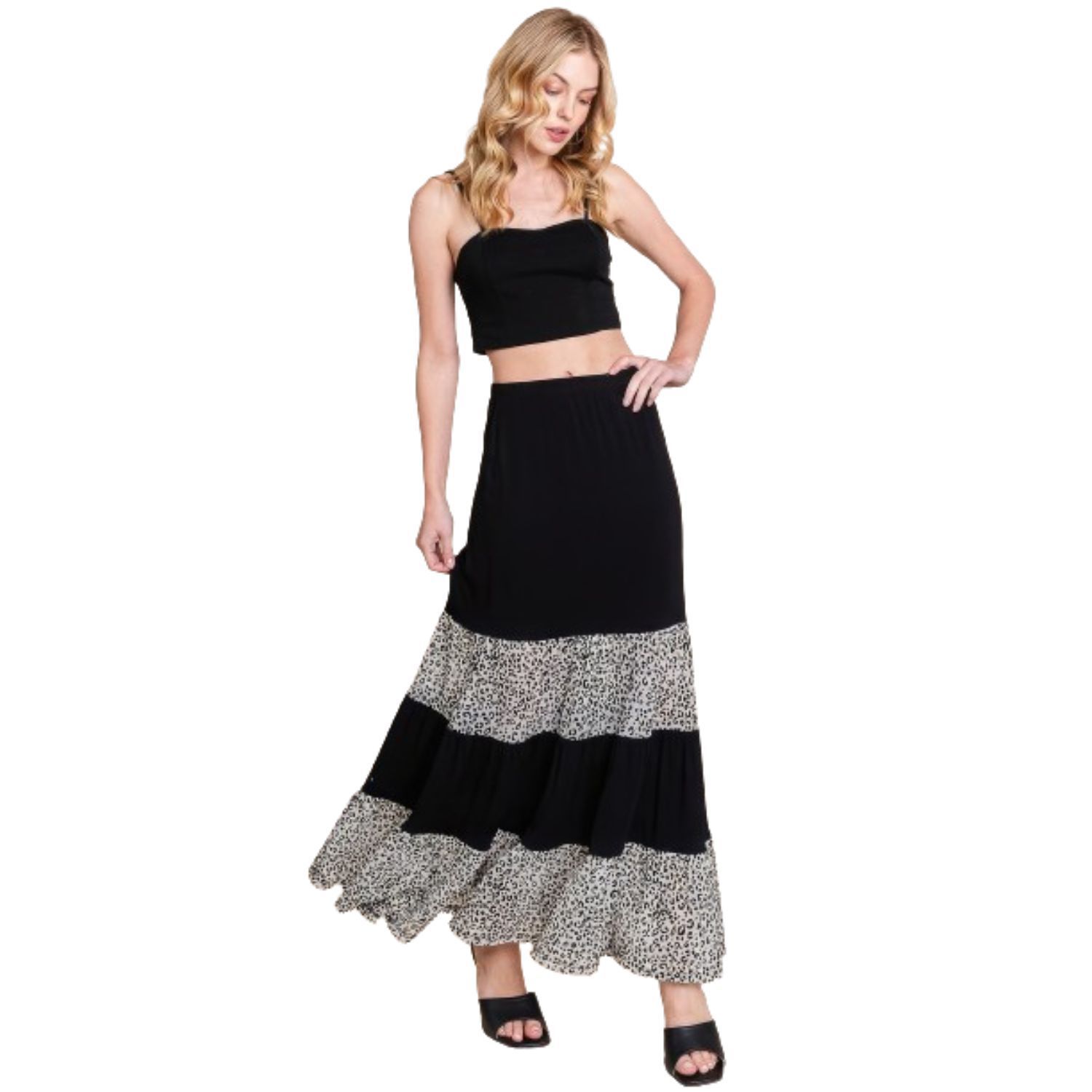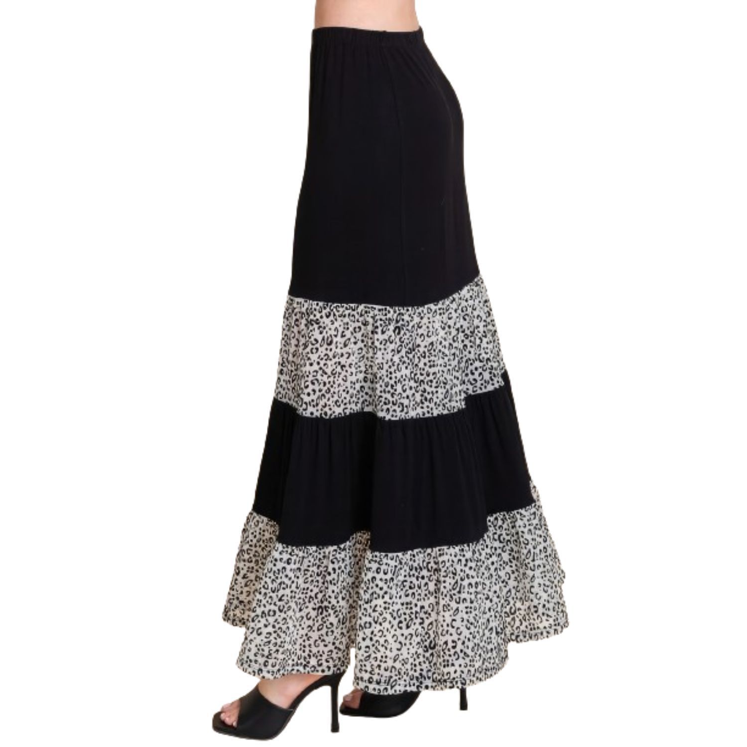 Long Tiered Contrast Fashion Skirt With Velvet Animal Print Mesh Large