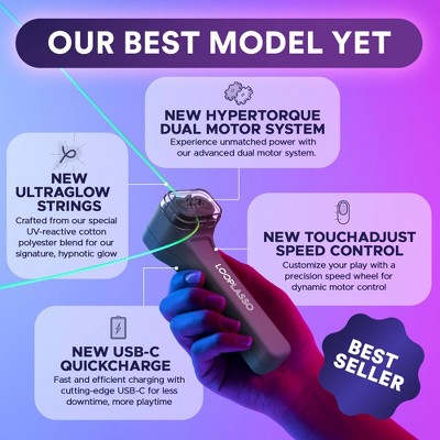 Unlock the magic of advanced play with the Loop Lasso X1, where cutting-edge technology and complex physics combine for a mind-blowing, interactive experience. Built with ultra-responsive mechanics and a powerful UV blacklight that lights up the night, the Loop Lasso X1 sends a glowing string floating through the air at breathtaking speeds, defying gravity creating colorful, illuminated shapes in the air with its vibrant UltraGlow strings. Whether you're buying for a child or letting your own inner child play, this toy promises to deliver unforgettable experiences and endless play. It's exhilarating, educational, long-lasting, and safe the perfect addition to any toy collection or gift. Don t miss out on the toy that everyone s talking about, discover why the Loop Lasso X1 is the ultimate choice for those who crave cutting-edge fun. Highlights: Ultimate Play Experience: Discover the Loop Lasso X1, where cutting-edge engineering meets interactive fun, allowing a glowing string to levitate at breathtaking speeds. Advanced Glow Technology: Equipped with UV-reactive UltraGlow strings that shine brilliantly in the dark, perfect for captivating visual displays at parties or concerts. Portable and Rechargeable: Designed for convenience, the Loop Lasso X1 features a compact, USB-C rechargeable design, ensuring it s always ready for action, anywhere and anytime. Smart Safety Features: Includes Intelligent Power-Cutoff Feature to ensure a safe play environment for users of all ages. Viral Sensation: Join the millions captivated by the Loop Lasso X1, a trending phenomenon with over 250 million views across social platforms. Made for Everyone: A must-have for kids, teens, and adults, making it an ideal gift for any occasion. Designed by Experts: Crafted with precision by engineers with a background in aerospace technology, merging physics with fun. Hyper Responsive: Crafted to respond instantly to your movements, providing a seamless interactive experience that glows and feels like magic. Specifications: Suggested Age: 6 Years and Up Type of Game: Electronic Games CPSC Choking Hazard Warnings: Choking_hazard_small_parts Number of Players: 1 Player Educational Focus: Fine Motor Skills, Creativity Battery: 1 Non-Universal Lithium Ion, Required, Included