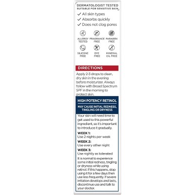 Revitalift Derm Intensives Night Serum with 0.3% Pure Retinol is our most potent and has our highest concentration of Pure Retinol. So effective, in a clinical study, 100% of women showed reduction in wrinkles, even deep ones. Pure Retinol is a top dermatologist recommended anti-aging ingredient proven to fight key signs of aging such as wrinkles, even deep ones. With many retinols available in skincare, look for those that say PURE.Instructions:Week 1: Apply 2-3 drops to clean and dry skin twice a week and before Triple Power MoisturizerWeek 2: Use every other nightWeek 3: Use nightly as tolerated; Always use Broad Spectrum SPF in the AM to protect skinRead product carton before use
