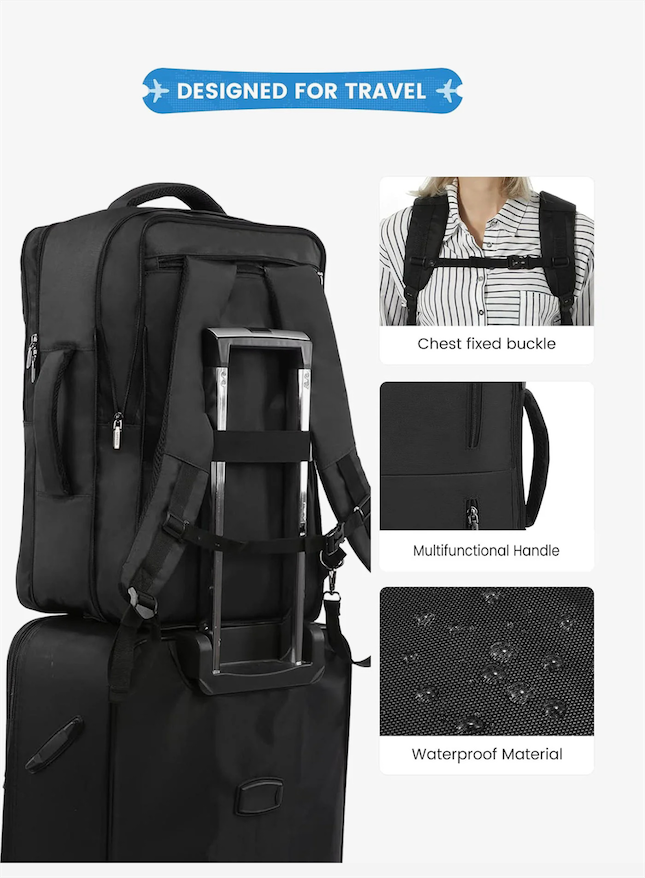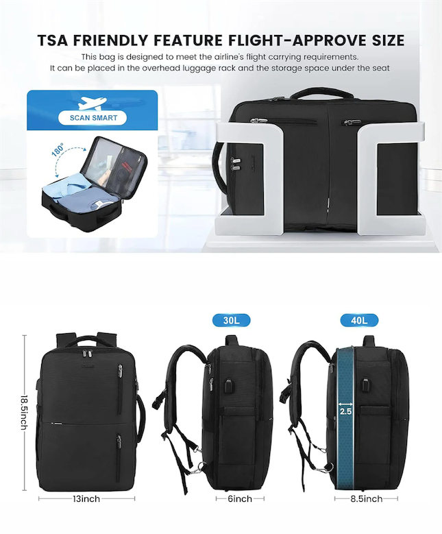 【PERSONAL ITEM AIRLINE APPROVED &TSA FRIENDLY】:The carry on backpack meets the maximum size allowed by IATA flights,can be fitted overhead and under-seat. The waterproof backpack is exclusive designed for airplane traveling,it can be opened freely 90-180 degree easily and quickly at the airport security. As carry on bag for airplanes,it is ideal for a weekend trip, business trip. Regular sizes: 18.5*14*6.9 in; extended sizes are 18.5*14*8.9 in,More comfortable for your journey daily life