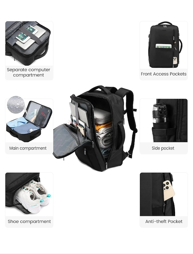 【EXPANDABLE &LARGE TRAVEL BACKPACK SHOE COMPARTMENT】:This large laptop backpack with an expandable design gives you a greater capacity of up to 37.5L. Unzipping to get larger storage space, you can easily fit 3-5days travel essential item. Equiped with Separate shoe compartment,it is crafted to bottom of backpack carry on to keep the shoes seperately and everything else clean. Toiletry bag is made of high density water resistant material can help you to separate dry and wet items