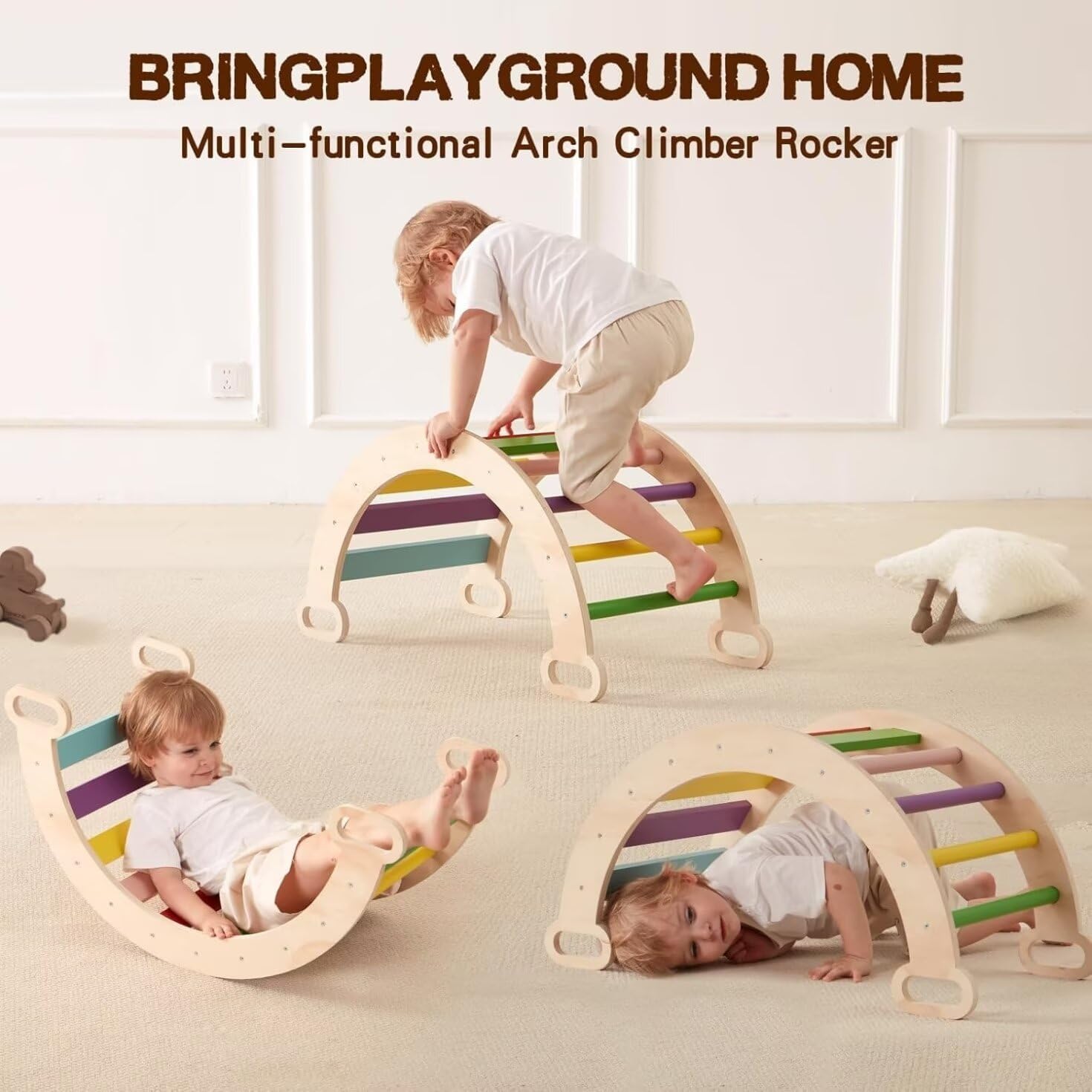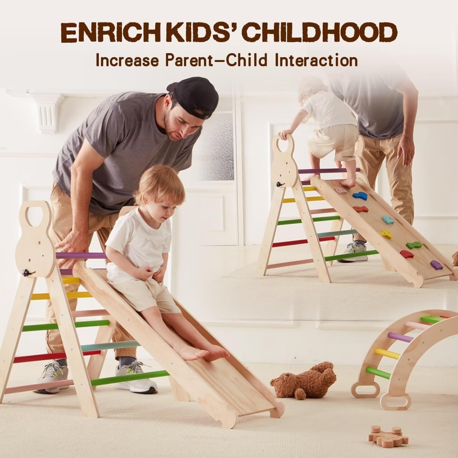 7-in-1 Montessori Toddler Climbing Toys Indoor:The toddler climbing play set includes a pikler triangle, a climbing arch, and a double sided reversible thick board (climbing and slide) . Each section is a separate climbing unit, providing endless possibilities for combining them in different ways. In addition, the Triangle Ladder has multiple locking positions so you can adjust the incline as you climb or slide