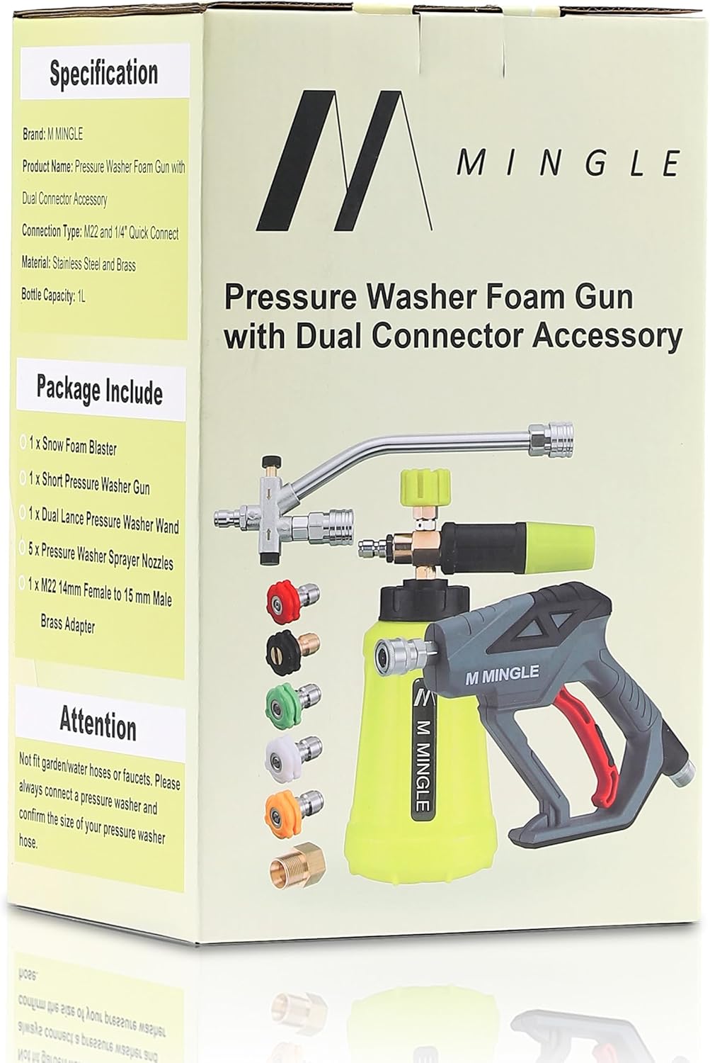 M MINGLE High Pressure Washer Gun with Foam Cannon, Foam Cannon Dual Connector Accessory, Car Wash Foam Gun Kit 1/4 Inch Quick Connector, 5 Pressure Washer Nozzle Tips