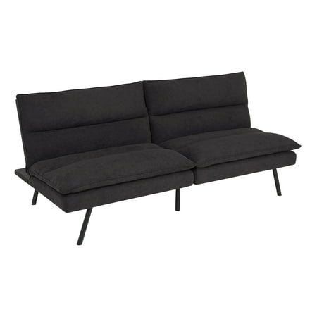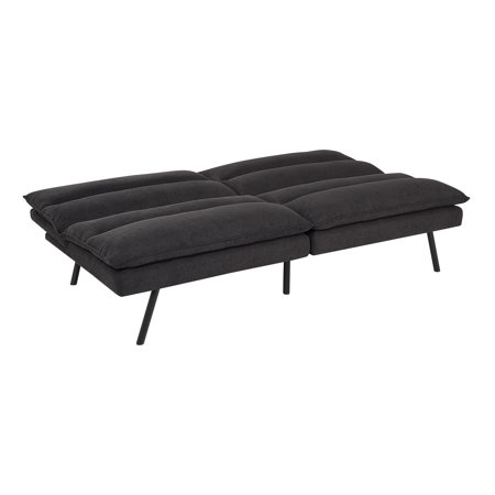 Split seat and back design Upholstery: 100% polyester Simple assembly required. Manual included Supports up to 600 lbs Fill: 100% polyurethane foam Weight: 81.6 lbs Converts from futon to sleeper in seconds Futon care: Spot clean with wet cloth or professional fabric cleaner. Do Not expose memory foam to direct sunlight. Sturdy futon frame and metal legs Seat dimensions: 71.25in x 33.46in x 31.49in Memory foam provides good support Sleep dimensions: 71.25in x 41.33in x 16.92in