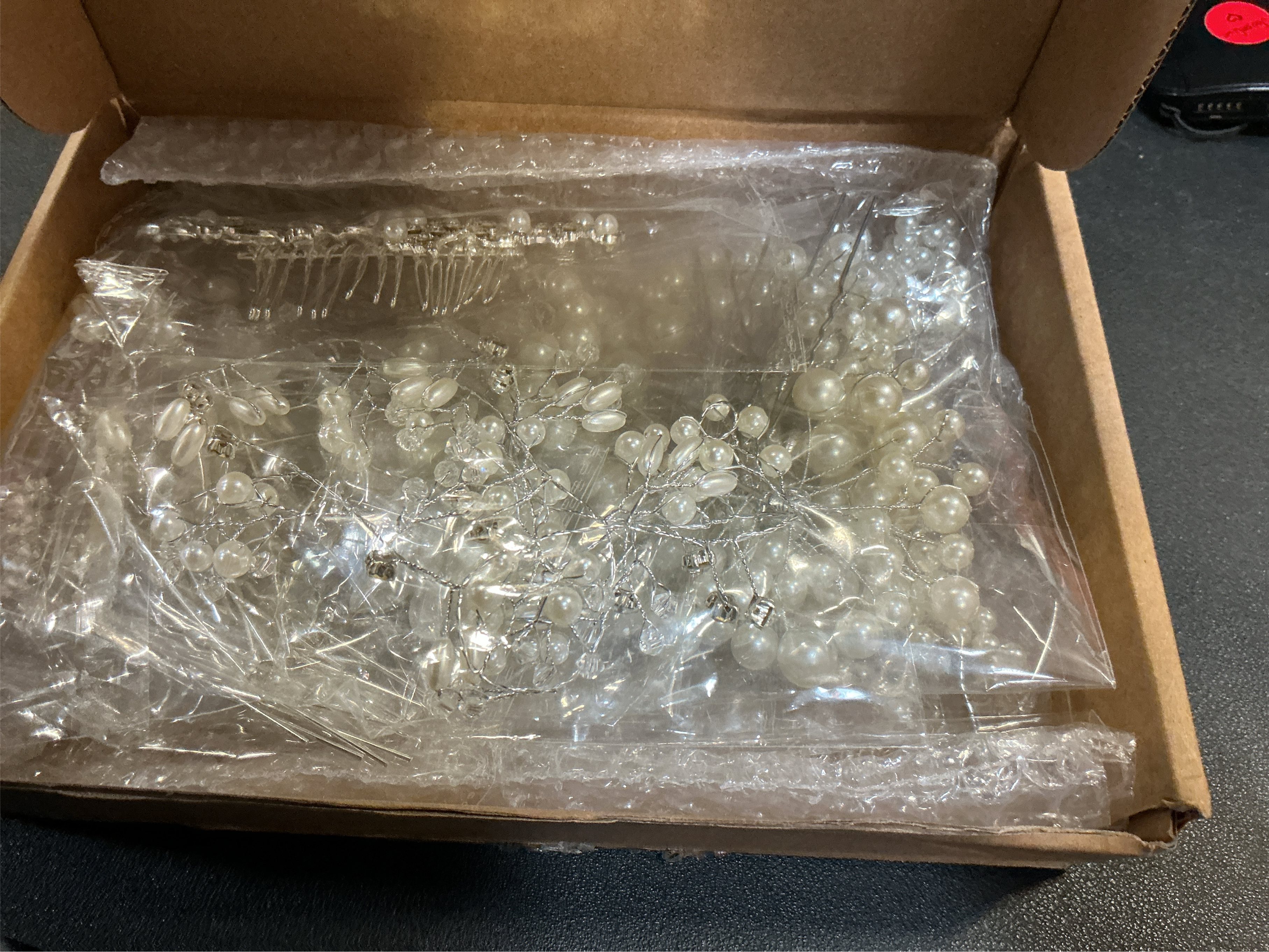 Main material: alloy, transparent crystal, rhinestone, faux pearl, the pearl trim is connected to the adjustable copper wire and you can adjust the position as needed