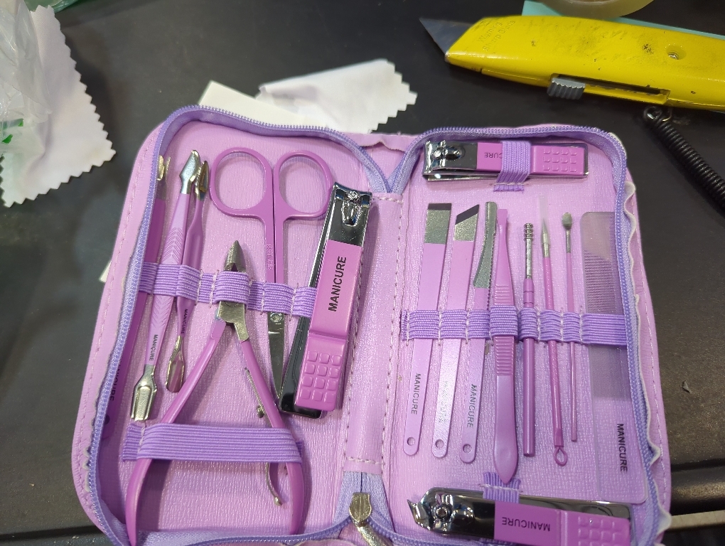 16 In 1 Manicure Kit - Professional manicure & pedicure set includes hand care tools: Curved Nail Clipper, Oblique Nail Clipper, Nail Scraper, Nail Cleaner, Glass Nail File and V-Shape Pusher; toenail care sets: Dead Skin Pliers, Toenail Clipper, Flat Pedicure Knife, Oblique Pedicure Knife, Curved Pedicure Knife; facial grooming kits: Scissors, Acne Needle, Ear Spoon, Honey-Spoon Shape Ear Picker, Eyebrow Clip. A full set of nail/foot/facial care tools to meet your daily needs.