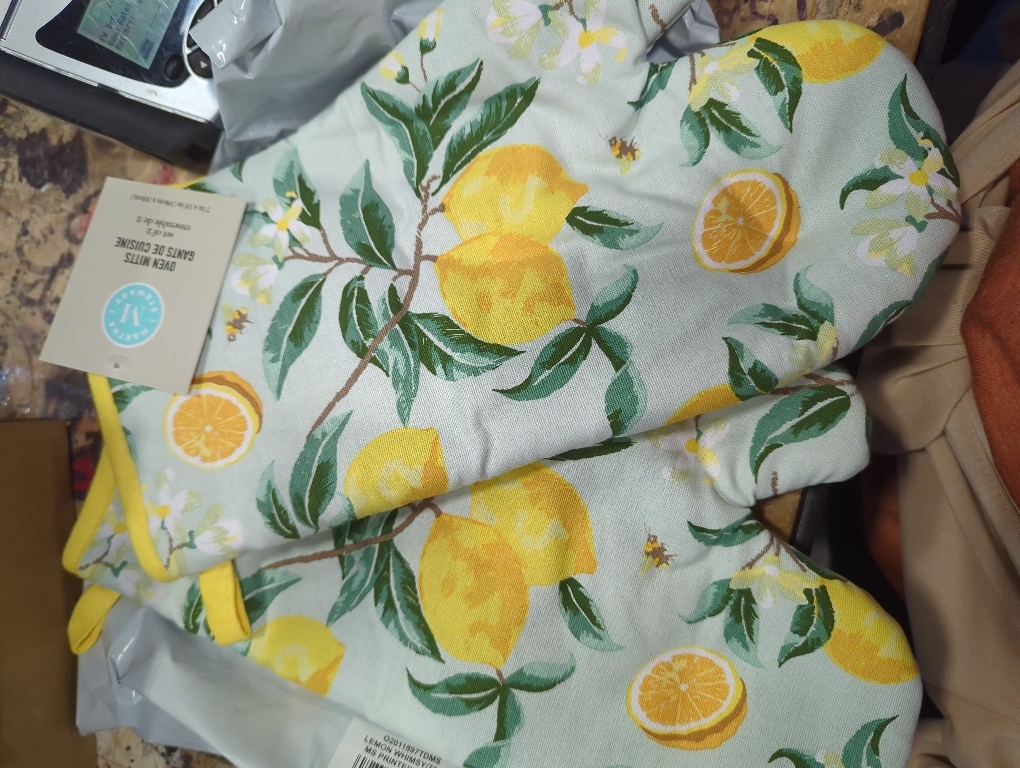 COORDINATING KITCHEN LINENS: Display your oven mitts with coordinating kitchen essentials from the Martha Stewart Lemon Whimsy collection that includes matching kitchen towels and oven mitts for a coordinated look. Sold separately.